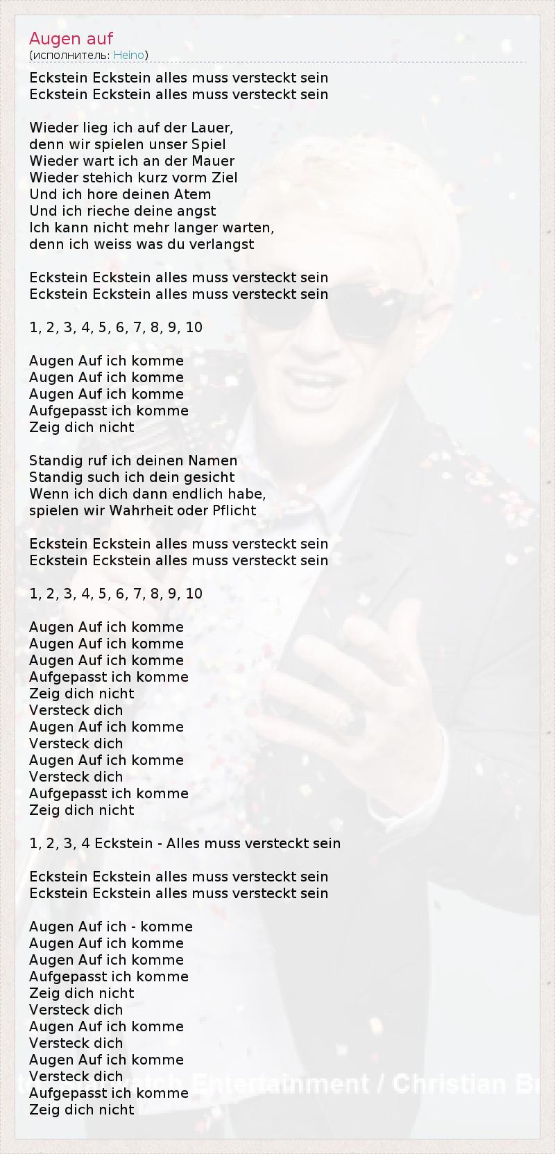 Это интересно:Heino (born 13 December 1938 in Düsseldorf as Heinz Georg Kramm) is a German singer of popular music (Schlager) and traditional Volksmusik.With his booming voice, bright blonde hair, and ever present sunglasses (due to exophthalmos), Heino is considered by many an icon of kitsch and in the English-speaking world the Latin American themes of many of his songs lending themselves to jokes about German emigration to South America after World War II.Heino's biggest hits"Jenseits des Tales" (1966)"Wenn die bunten Fahnen wehen" (1967)"Wir lieben die Stürme" (1968)"Zu der Ponderosa reiten wir" (1968)"Bergvagabunden"... продолжение