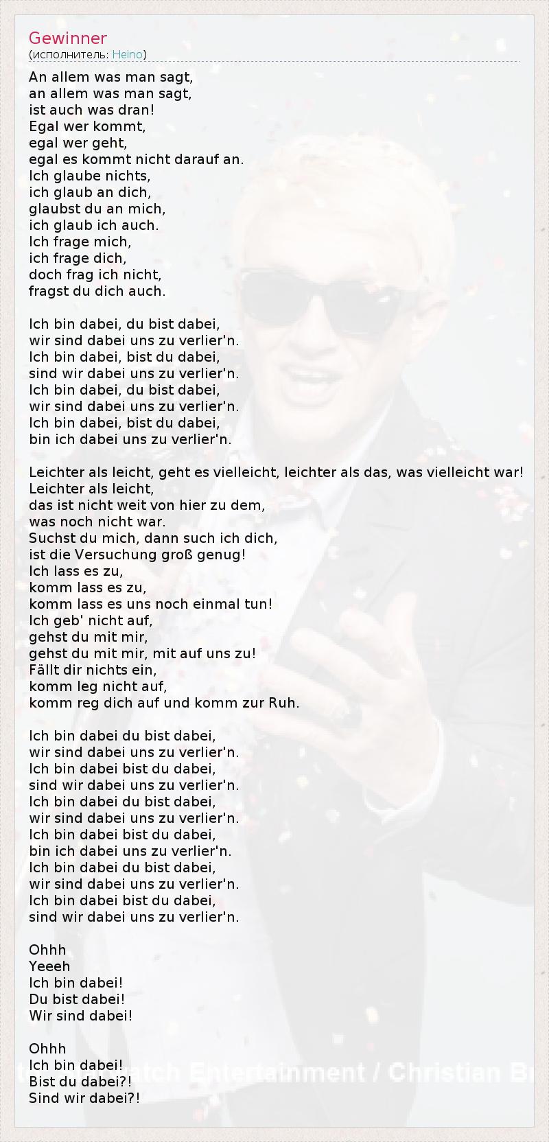 Это интересно:Heino (born 13 December 1938 in Düsseldorf as Heinz Georg Kramm) is a German singer of popular music (Schlager) and traditional Volksmusik.With his booming voice, bright blonde hair, and ever present sunglasses (due to exophthalmos), Heino is considered by many an icon of kitsch and in the English-speaking world the Latin American themes of many of his songs lending themselves to jokes about German emigration to South America after World War II.Heino's biggest hits"Jenseits des Tales" (1966)"Wenn die bunten Fahnen wehen" (1967)"Wir lieben die Stürme" (1968)"Zu der Ponderosa reiten wir" (1968)"Bergvagabunden"... продолжение