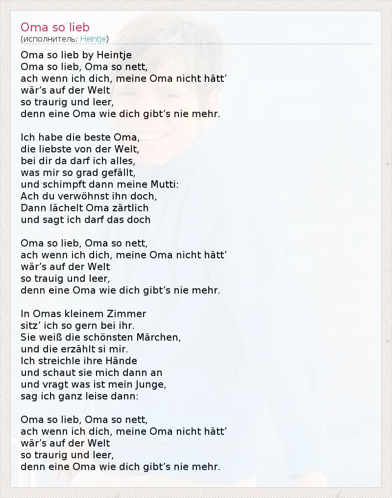 Ома , так Либ по Heintje Ома , так Либ , Ома , так нетто , ACH Венна Ich Dich , Моя Ома Nicht Атта " Война Auf Der Welt так Traurig унд Леер , Nie Mehr Denn сделайте OMA Wie Dich Gibt в . Ich хабе умирают Beste Ома , умереть liebste фон дер Welt , бай реж да Darf ич Alles , был мир так Град gefällt , унд schimpft Данн Моя Мутти : АХ Du verwöhnst IHN Дочь , Данн lächelt Ома zärtlich унд САГТ ич Darf дас Дочь Ома , так Либ , Ома , так нетто , ACH Венна Ich Dich , Моя Ома Nicht Атта " Война Auf Der Welt так trauig унд Леер , Nie Mehr Denn сделайте OMA Wie Dich Gibt в . В Omas kleinem Zimmer товарищество " Ich так Gern бай ММСП. Sie Weiss умирают schönsten Märchen , унд умереть erzählt си Мир. Ich streichle Ире Hände унд schaut Sie Мичиган Данн унд vragt был ист майн Юнге , SAG ич Ганц Leise Данн : Ома , так Либ , Ома , так нетто , ACH Венна Ich Dich , Моя Ома Nicht Атта " Война Auf Der Welt так Traurig унд Леер , Nie Mehr Denn сделайте OMA Wie Dich Gibt в .