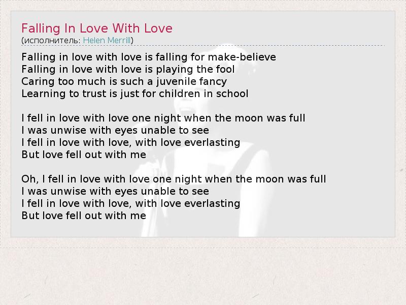 Falling in love with love is falling for make-believe Falling in love with love is playing the fool Caring too much is such a juvenile fancy Learning to trust is just for children in school I fell in love with love one night when the moon was full I was unwise with eyes unable to see I fell in love with love, with love everlasting But love fell out with me Oh, I fell in love with love one night when the moon was full I was unwise with eyes unable to see I fell in love with love, with love everlasting But love fell out with me