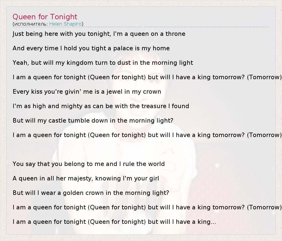 А как ты думаешь, о чем песня "Queen for Tonight" ?