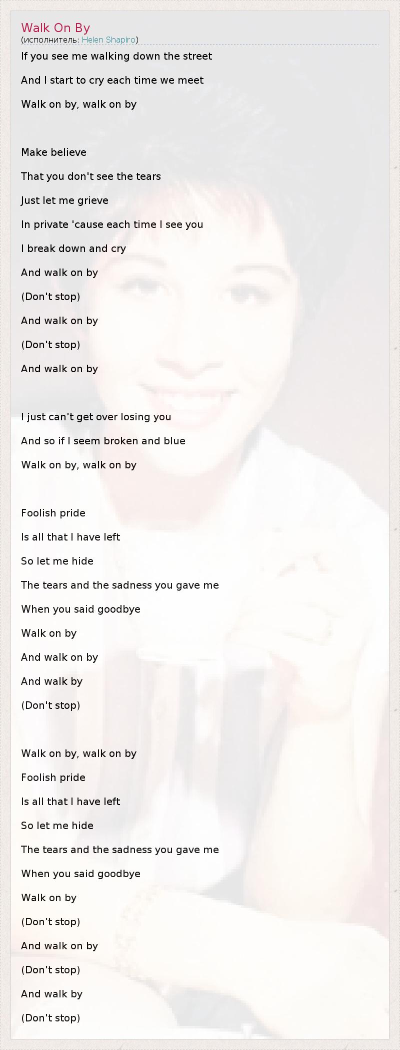 If you see me walking down the street And I start to cry each time we meet Walk on by, walk on by Make believe That you don't see the tears Just let me grieve In private 'cause each time I see you I break down and cry And walk on by (Don't stop) And walk on by (Don't stop) And walk on by I just can't get over losing you And so if I seem broken and blue Walk on by, walk on by Foolish pride Is all that I have left So let me hide The tears and the sadness you gave me When you said goodbye Walk on by And walk on by And walk by (Don't stop) Walk on by, walk on by Foolish pride Is all that I have left So let me hide The tears and the sadness you gave me When you said goodbye Walk on by (Don't stop) And walk on by (Don't stop) And walk by (Don't stop)