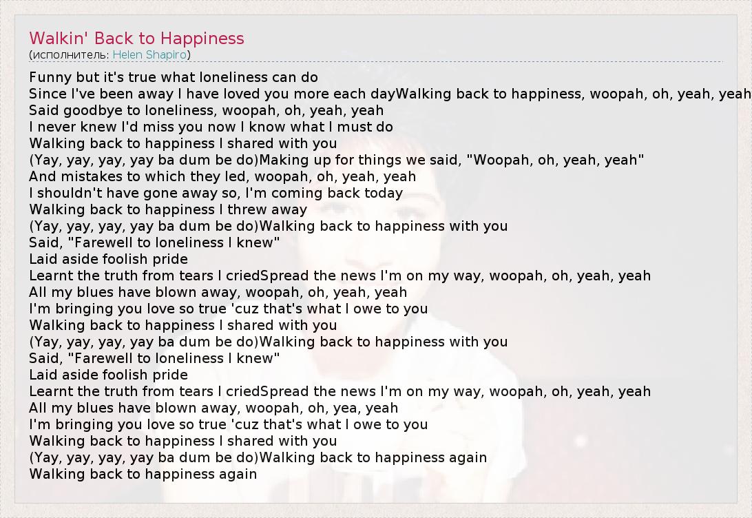 Funny but it's true what loneliness can do Since I've been away I have loved you more each dayWalking back to happiness, woopah, oh, yeah, yeah Said goodbye to loneliness, woopah, oh, yeah, yeah I never knew I'd miss you now I know what I must do Walking back to happiness I shared with you (Yay, yay, yay, yay ba dum be do)Making up for things we said, "Woopah, oh, yeah, yeah" And mistakes to which they led, woopah, oh, yeah, yeah I shouldn't have gone away so, I'm coming back today Walking back to happiness I threw away (Yay, yay, yay, yay ba dum be do)Walking back to happiness with you Said, "Farewell to loneliness I knew" Laid aside foolish pride Learnt the truth from tears I criedSpread the news I'm on my way, woopah, oh, yeah, yeah All my blues have blown away, woopah, oh, yeah, yeah I'm bringing you love so true 'cuz that's what I owe to you Walking back to happiness I shared with you (Yay, yay, yay, yay ba dum be do)Walking back to happiness with you Said, "Farewell to loneliness I knew" Laid aside foolish pride Learnt the truth from tears I criedSpread the news I'm on my way, woopah, oh, yeah, yeah All my blues have blown away, woopah, oh, yea, yeah I'm bringing you love so true 'cuz that's what I owe to you Walking back to happiness I shared with you (Yay, yay, yay, yay ba dum be do)Walking back to happiness again Walking back to happiness again