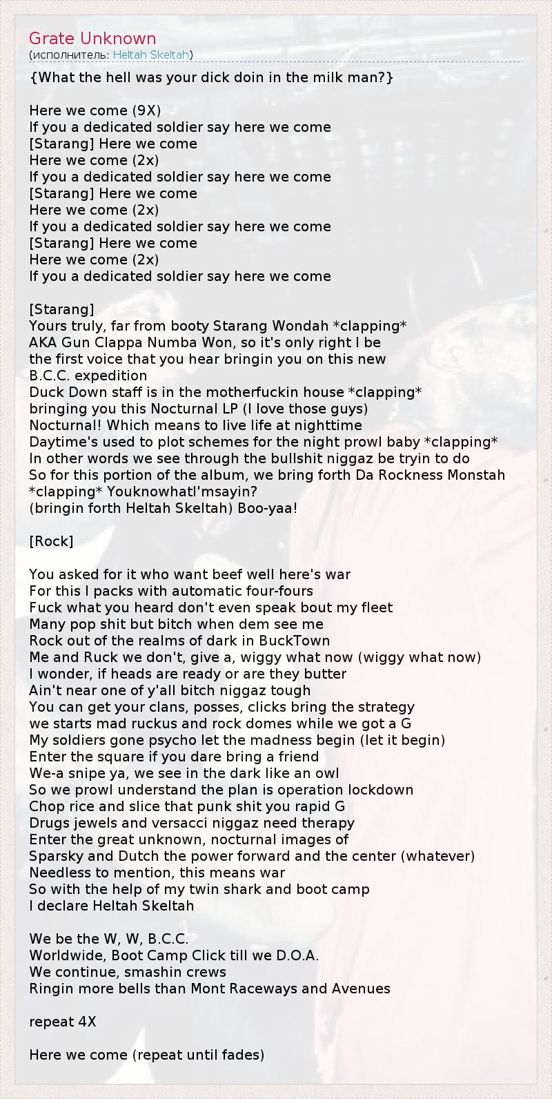Это интересно:"Для нас не существует разделения на Запад и Восток, – говорят во всех своих интервью Рок (Rock) и Рак (Ruck), участники прославленного бруклинского рэп-дуэта HELTAH SKELTAH. – Бог и Земля – одни для всех! Все эти дурацкие разборки, кто лучше, – лишь для тех псевдорэпперов, которые в детстве не доиграли в войнушку. Уж лучше бы они обратили внимание на другую проблему – на посредственность современного... продолжение