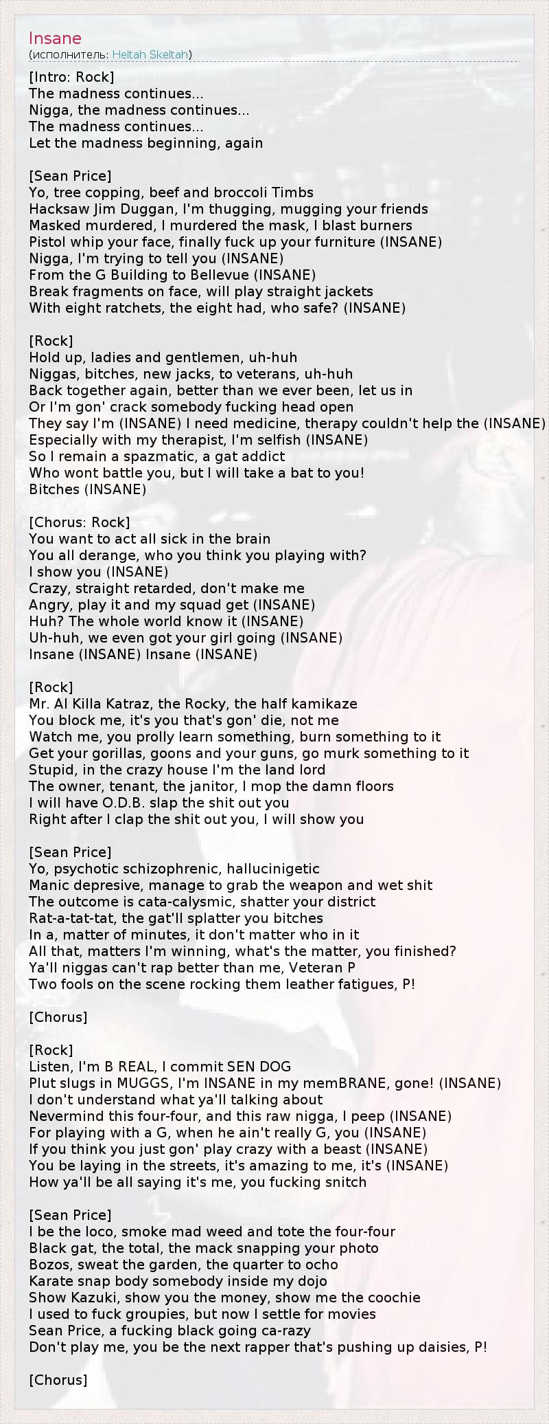 [Intro: Rock] The madness continues... Nigga, the madness continues... The madness continues... Let the madness beginning, again [Sean Price] Yo, tree copping, beef and broccoli Timbs Hacksaw Jim Duggan, I'm thugging, mugging your friends Masked murdered, I murdered the mask, I blast burners Pistol whip your face, finally fuck up your furniture (INSANE) Nigga, I'm trying to tell you (INSANE) From the G Building to Bellevue (INSANE) Break fragments on face, will play straight jackets With eight ratchets, the eight had, who safe? (INSANE) [Rock] Hold up, ladies and gentlemen, uh-huh Niggas, bitches, new jacks, to veterans, uh-huh Back together again, better than we ever been, let us in Or I'm gon' crack somebody fucking head open They say I'm (INSANE) I need medicine, therapy couldn't help the (INSANE) Especially with my therapist, I'm selfish (INSANE) So I remain a spazmatic, a gat addict Who wont battle you, but I will take a bat to you! Bitches (INSANE) [Chorus: Rock] You want to act all sick in the brain You all derange, who you think you playing with? I show you (INSANE) Crazy, straight retarded, don't make me Angry, play it and my squad get (INSANE) Huh? The whole world know it (INSANE) Uh-huh, we even got your girl going (INSANE) Insane (INSANE) Insane (INSANE) [Rock] Mr. Al Killa Katraz, the Rocky, the half kamikaze You block me, it's you that's gon' die, not me Watch me, you prolly learn something, burn something to it Get your gorillas, goons and your guns, go murk something to it Stupid, in the crazy house I'm the land lord The owner, tenant, the janitor, I mop the damn floors I will have O.D.B. slap the shit out you Right after I clap the shit out you, I will show you [Sean Price] Yo, psychotic schizophrenic, hallucinigetic Manic depresive, manage to grab the weapon and wet shit The outcome is cata-calysmic, shatter your district Rat-a-tat-tat, the gat'll splatter you bitches In a, matter of minutes, it don't matter who in it All that, matters I'm winning, what's the matter, you finished? Ya'll niggas can't rap better than me, Veteran P Two fools on the scene rocking them leather fatigues, P! [Chorus] [Rock] Listen, I'm B REAL, I commit SEN DOG Plut slugs in MUGGS, I'm INSANE in my memBRANE, gone! (INSANE) I don't understand what ya'll talking about Nevermind this four-four, and this raw nigga, I peep (INSANE) For playing with a G, when he ain't really G, you (INSANE) If you think you just gon' play crazy with a beast (INSANE) You be laying in the streets, it's amazing to me, it's (INSANE) How ya'll be all saying it's me, you fucking snitch [Sean Price] I be the loco, smoke mad weed and tote the four-four Black gat, the total, the mack snapping your photo Bozos, sweat the garden, the quarter to ocho Karate snap body somebody inside my dojo Show Kazuki, show you the money, show me the coochie I used to fuck groupies, but now I settle for movies Sean Price, a fucking black going ca-razy Don't play me, you be the next rapper that's pushing up daisies, P! [Chorus]