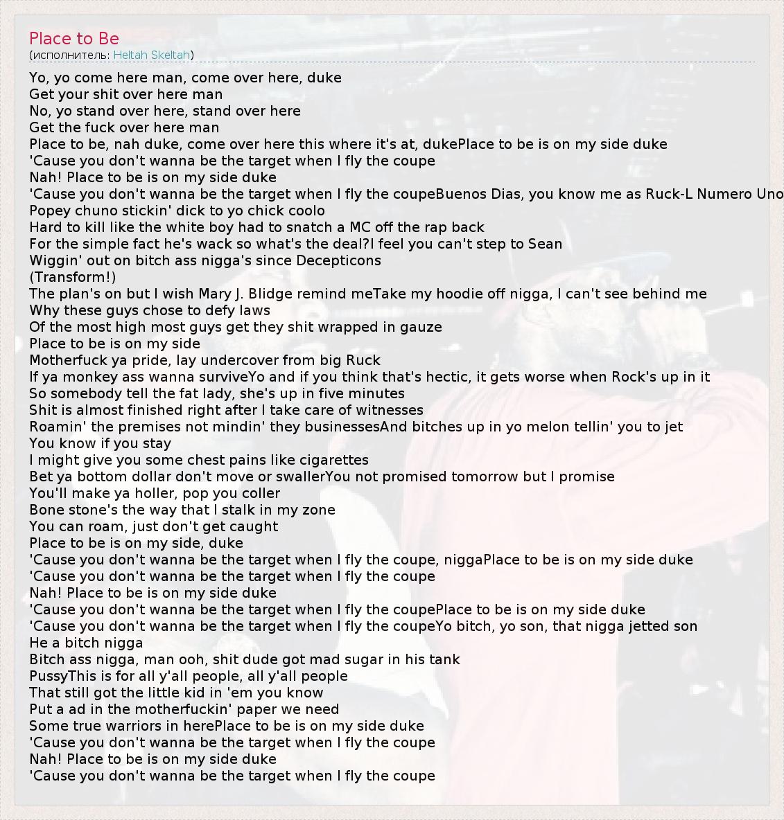 Yo, yo come here man, come over here, duke Get your shit over here man No, yo stand over here, stand over here Get the fuck over here man Place to be, nah duke, come over here this where it's at, dukePlace to be is on my side duke 'Cause you don't wanna be the target when I fly the coupe Nah! Place to be is on my side duke 'Cause you don't wanna be the target when I fly the coupeBuenos Dias, you know me as Ruck-L Numero Uno Popey chuno stickin' dick to yo chick coolo Hard to kill like the white boy had to snatch a MC off the rap back For the simple fact he's wack so what's the deal?I feel you can't step to Sean Wiggin' out on bitch ass nigga's since Decepticons (Transform!) The plan's on but I wish Mary J. Blidge remind meTake my hoodie off nigga, I can't see behind me Why these guys chose to defy laws Of the most high most guys get they shit wrapped in gauze Place to be is on my side Motherfuck ya pride, lay undercover from big Ruck If ya monkey ass wanna surviveYo and if you think that's hectic, it gets worse when Rock's up in it So somebody tell the fat lady, she's up in five minutes Shit is almost finished right after I take care of witnesses Roamin' the premises not mindin' they businessesAnd bitches up in yo melon tellin' you to jet You know if you stay I might give you some chest pains like cigarettes Bet ya bottom dollar don't move or swallerYou not promised tomorrow but I promise You'll make ya holler, pop you coller Bone stone's the way that I stalk in my zone You can roam, just don't get caught Place to be is on my side, duke 'Cause you don't wanna be the target when I fly the coupe, niggaPlace to be is on my side duke 'Cause you don't wanna be the target when I fly the coupe Nah! Place to be is on my side duke 'Cause you don't wanna be the target when I fly the coupePlace to be is on my side duke 'Cause you don't wanna be the target when I fly the coupeYo bitch, yo son, that nigga jetted son He a bitch nigga Bitch ass nigga, man ooh, shit dude got mad sugar in his tank PussyThis is for all y'all people, all y'all people That still got the little kid in 'em you know Put a ad in the motherfuckin' paper we need Some true warriors in herePlace to be is on my side duke 'Cause you don't wanna be the target when I fly the coupe Nah! Place to be is on my side duke 'Cause you don't wanna be the target when I fly the coupe