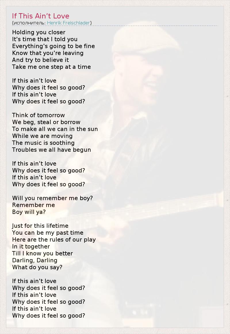 Holding you closer It's time that I told you Everything's going to be fine Know that you're leaving And try to beliеve it Take me one step at a time If this ain't love Why does it feel so good? If this ain't love Why does it feel so good? Think of tomorrow We beg, steal or borrow To make all we can in the sun While we are moving The music is soothing Troubles we all have begun If this ain't love Why does it feel so good? If this ain't love Why does it feel so good? Will you remember me boy? Remember me Boy will ya? Just for this lifetime You can be my past time Here are the rules of our play In it together Till I know you better Darling, Darling What do you say? If this ain't love Why does it feel so good? If this ain't love Why does it feel so good? If this ain't love Why does it feel so good?
