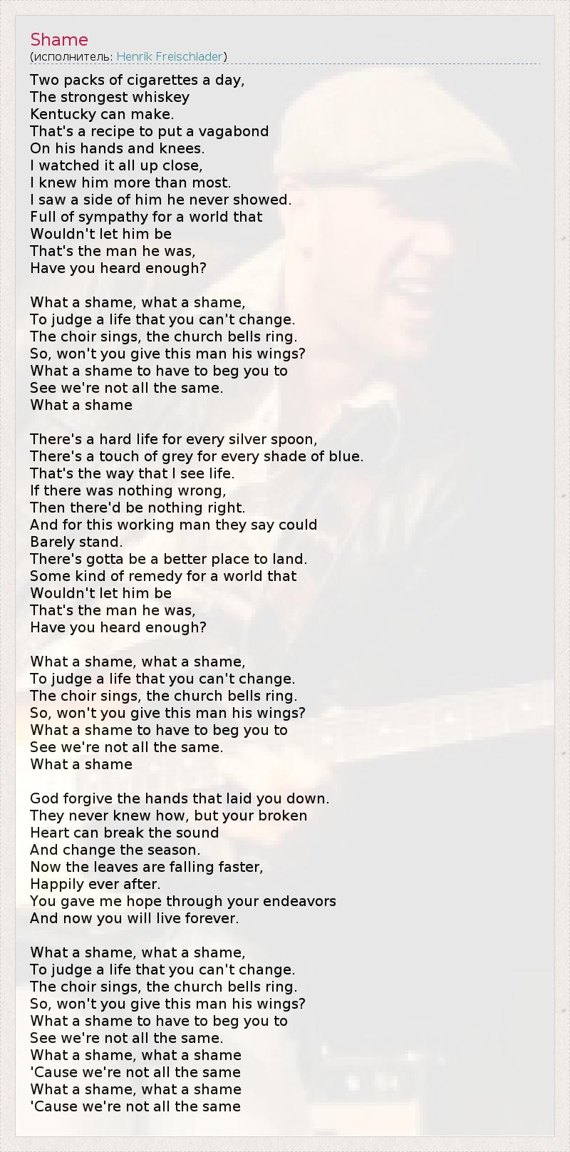 Two packs of cigarettes a day, The strongest whiskey Kentucky can make. That's a recipe to put a vagabond On his hands and knees. I watched it all up close, I knew him more than most. I saw a side of him he never showed. Full of sympathy for a world that Wouldn't let him be That's the man he was, Have you heard enough? What a shame, what a shame, To judge a life that you can't change. The choir sings, the church bells ring. So, won't you give this man his wings? What a shame to have to beg you to See we're not all the same. What a shame There's a hard life for every silver spoon, There's a touch of grey for every shade of blue. That's the way that I see life. If there was nothing wrong, Then there'd be nothing right. And for this working man they say could Barely stand. There's gotta be a better place to land. Some kind of remedy for a world that Wouldn't let him be That's the man he was, Have you heard enough? What a shame, what a shame, To judge a life that you can't change. The choir sings, the church bells ring. So, won't you give this man his wings? What a shame to have to beg you to See we're not all the same. What a shame God forgive the hands that laid you down. They never knew how, but your broken Heart can break the sound And change the season. Now the leaves are falling faster, Happily ever after. You gave me hope through your endeavors And now you will live forever. What a shame, what a shame, To judge a life that you can't change. The choir sings, the church bells ring. So, won't you give this man his wings? What a shame to have to beg you to See we're not all the same. What a shame, what a shame 'Cause we're not all the same What a shame, what a shame 'Cause we're not all the same
