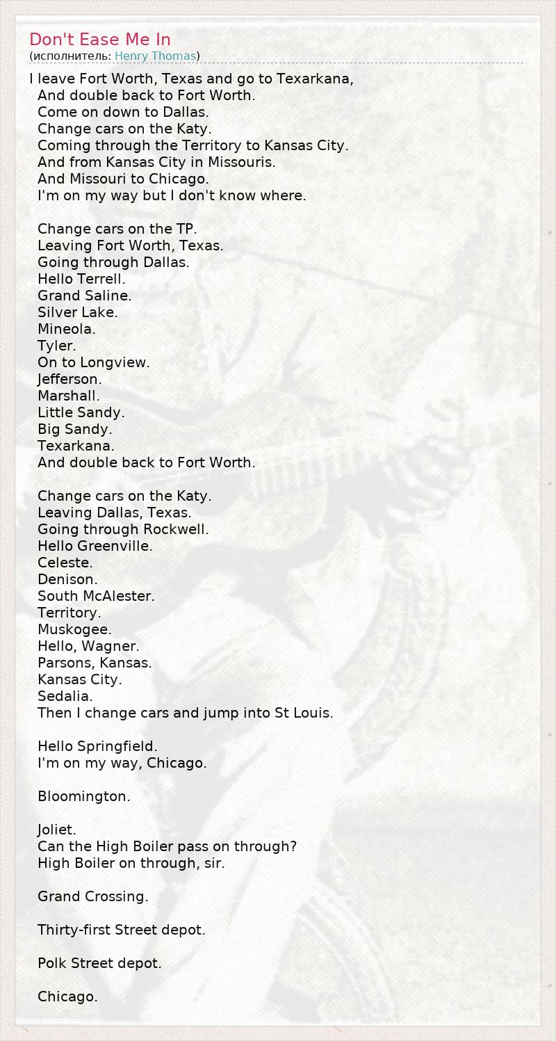 Это интересно:Генри Томас (англ. Henry Thomas 1874 — 1950-е) — Американский музыкант и автор песен, играющий в стиле сельский блюз.Томас, прозванный «Регтайм Техаса», родился в городе Биг Сенди, Техас, и начал свою музыкальную карьеру как путешествующий музыкант, в период с 1927 по 1929 записал 23 песни. Аккомпанировал себе на гитаре и флейте пана. Некоторые из его песен довольно сложно разделить по категориям... продолжение