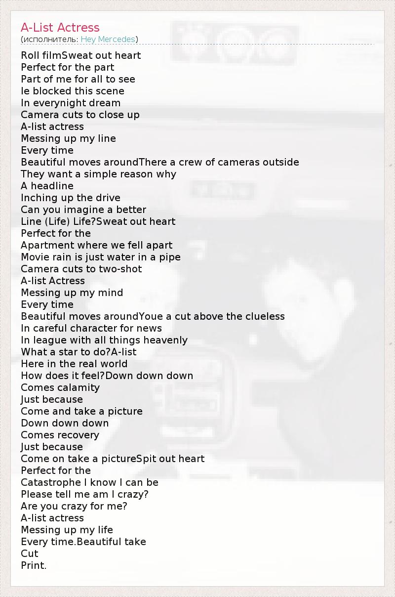 Roll filmSweat out heart Perfect for the part Part of me for all to see Ie blocked this scene In everynight dream Camera cuts to close up A-list actress Messing up my line Every time Beautiful moves aroundThere a crew of cameras outside They want a simple reason why A headline Inching up the drive Can you imagine a better Line (Life) Life?Sweat out heart Perfect for the Apartment where we fell apart Movie rain is just water in a pipe Camera cuts to two-shot A-list Actress Messing up my mind Every time Beautiful moves aroundYoue a cut above the clueless In careful character for news In league with all things heavenly What a star to do?A-list Here in the real world How does it feel?Down down down Comes calamity Just because Come and take a picture Down down down Comes recovery Just because Come on take a pictureSpit out heart Perfect for the Catastrophe I know I can be Please tell me am I crazy? Are you crazy for me? A-list actress Messing up my life Every time.Beautiful take Cut Print.