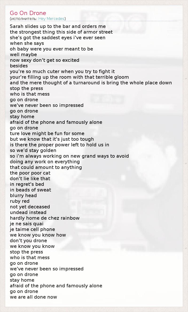 Sarah slides up to the bar and orders me the strongest thing this side of armor street she's got the saddest eyes i've ever seen when she says oh baby were you ever meant to be well maybe now sexy don't get so excited besides you're so much cuter when you try to fight it your're filling up the room with that terrible gloom and the mere thought of a turnaround is bring the whole place down stop the press who is that mess go on drone we've never been so impressed go on drone stay home afraid of the phone and famously alone go on drone ture love might be fun for some but we know that it's just too tough is there the proper power left to hold us in so we'd stay golden so i'm always working on new grand ways to avoid doing any work on everything that could amount to anything the poor poor cat don't lie like that in regret's bed in beads of sweat blurry head ruby red not yet deceased undead instead hardly home de chez rainbow je ne sais quai je taime cell phone we know you know how don't you drone we know you know stop the press who is that mess go on drone we've never been so impressed go on drone stay home afraid of the phone and famously alone go on drone we are all done now
