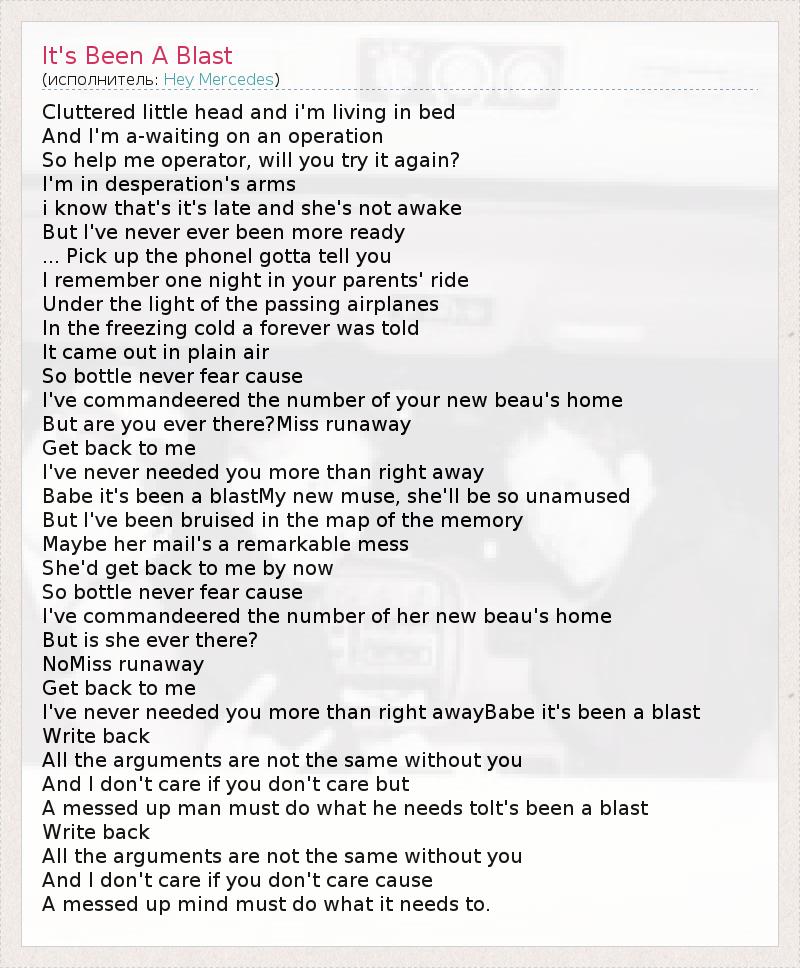 Cluttered little head and i'm living in bed And I'm a-waiting on an operation So help me operator, will you try it again? I'm in desperation's arms i know that's it's late and she's not awake But I've never ever been more ready ... Pick up the phoneI gotta tell you I remember one night in your parents' ride Under the light of the passing airplanes In the freezing cold a forever was told It came out in plain air So bottle never fear cause I've commandeered the number of your new beau's home But are you ever there?Miss runaway Get back to me I've never needed you more than right away Babe it's been a blastMy new muse, she'll be so unamused But I've been bruised in the map of the memory Maybe her mail's a remarkable mess She'd get back to me by now So bottle never fear cause I've commandeered the number of her new beau's home But is she ever there? NoMiss runaway Get back to me I've never needed you more than right awayBabe it's been a blast Write back All the arguments are not the same without you And I don't care if you don't care but A messed up man must do what he needs toIt's been a blast Write back All the arguments are not the same without you And I don't care if you don't care cause A messed up mind must do what it needs to.
