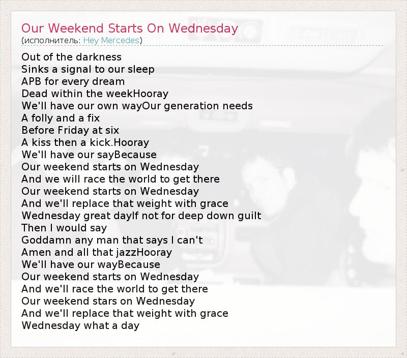Out of the darkness Sinks a signal to our sleep APB for every dream Dead within the weekHooray We'll have our own wayOur generation needs A folly and a fix Before Friday at six A kiss then a kick.Hooray We'll have our sayBecause Our weekend starts on Wednesday And we will race the world to get there Our weekend starts on Wednesday And we'll replace that weight with grace Wednesday great dayIf not for deep down guilt Then I would say Goddamn any man that says I can't Amen and all that jazzHooray We'll have our wayBecause Our weekend starts on Wednesday And we'll race the world to get there Our weekend stars on Wednesday And we'll replace that weight with grace Wednesday what a day