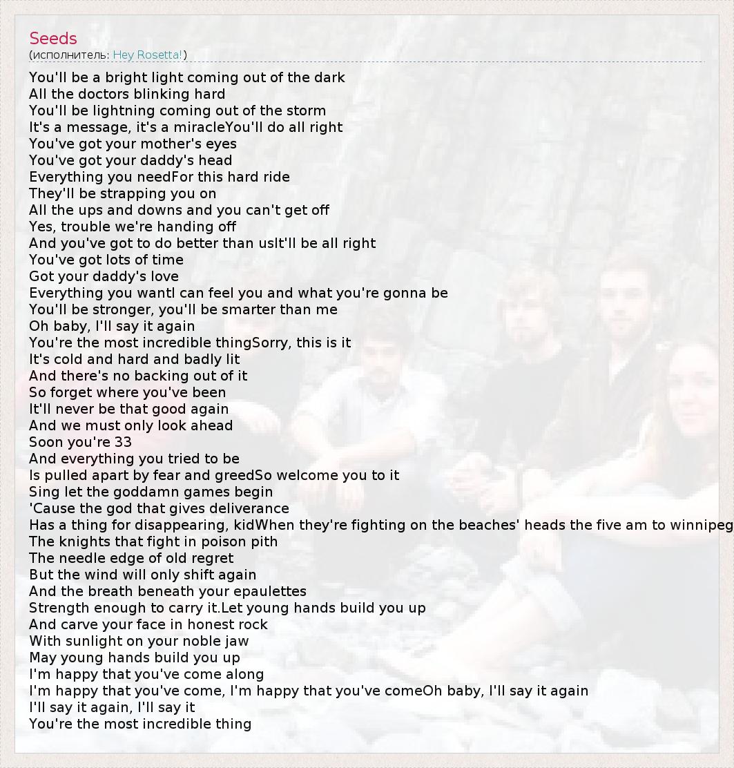 Это интересно:http://www.heyrosetta.com/Hey Rosetta! is a six-piece Canadian indie rock band from St. John's, Newfoundland and Labrador. Known for its energized live shows, the band creates a massive, layered sound by incorporating piano, violin and cello into the traditional four-piece garage rock sound.HistoryTheir influences include The Beatles and Jeff Buckley, while also incorporating the layered production of contemporary indie bands such as Arcade Fire and Hope of the States.The band earned acclaim at the 2006 MusicNL awards, taking home the awards for Group of the Year, Pop/Rock Group of the Year, CBC Galaxie Rising... продолжение
