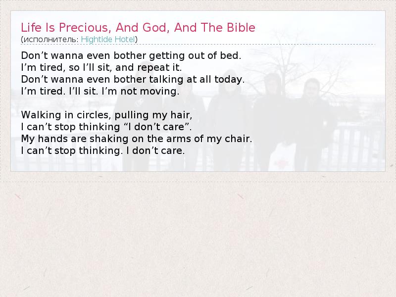 А как ты думаешь, о чем песня "Life Is Precious, And God, And The Bible" ?