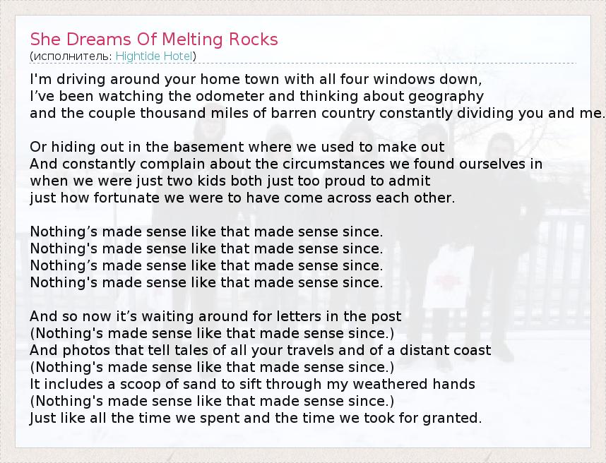 А как ты думаешь, о чем песня "She Dreams Of Melting Rocks" ?