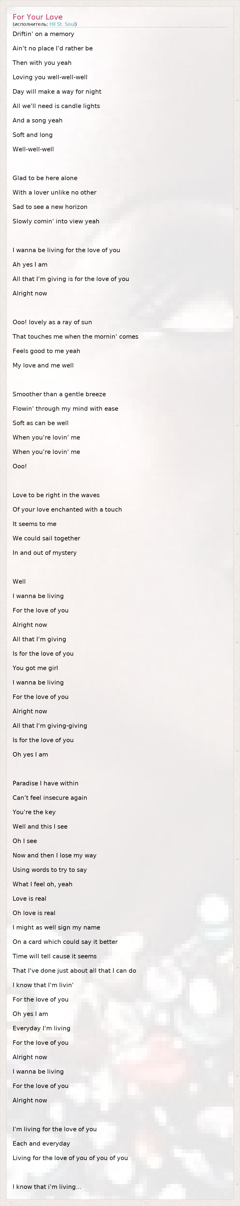 Driftin' on a memory Ain't no place I'd rather be Then with you yeah Loving you well-well-well Day will make a way for night All we'll need is candle lights And a song yeah Soft and long Well-well-well Glad to be here alone With a lover unlike no other Sad to see a new horizon Slowly comin' into view yeah I wanna be living for the love of you Ah yes I am All that I'm giving is for the love of you Alright now Ooo! lovely as a ray of sun That touches me when the mornin' comes Feels good to me yeah My love and me well Smoother than a gentle breeze Flowin' through my mind with ease Soft as can be well When you're lovin' me When you're lovin' me Ooo! Love to be right in the waves Of your love enchanted with a touch It seems to me We could sail together In and out of mystery Well I wanna be living For the love of you Alright now All that I'm giving Is for the love of you You got me girl I wanna be living For the love of you Alright now All that I'm giving-giving Is for the love of you Oh yes I am Paradise I have within Can't feel insecure again You're the key Well and this I see Oh I see Now and then I lose my way Using words to try to say What I feel oh, yeah Love is real Oh love is real I might as well sign my name On a card which could say it better Time will tell cause it seems That I've done just about all that I can do I know that I'm livin' For the love of you Oh yes I am Everyday I'm living For the love of you Alright now I wanna be living For the love of you Alright now I'm living for the love of you Each and everyday Living for the love of you of you of you I know that i'm living...