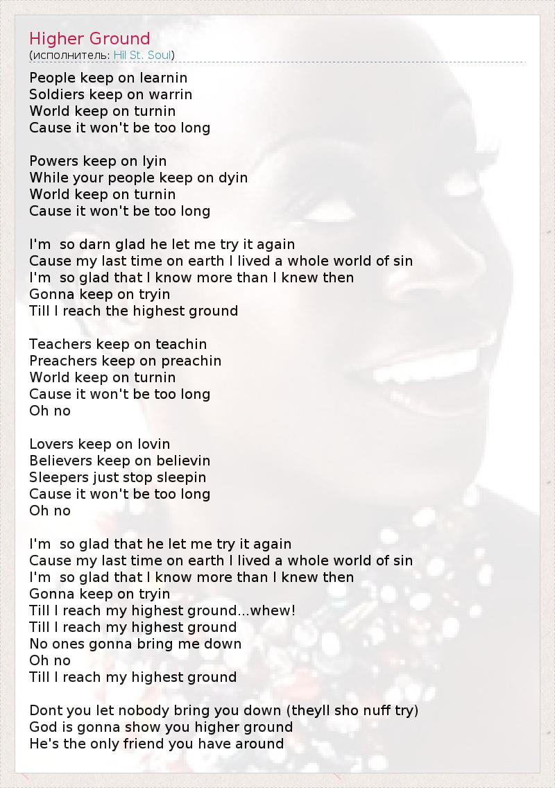 People keep on learnin Soldiers keep on warrin World keep on turnin Cause it won't be too long Powers keep on lyin While your people keep on dyin World keep on turnin Cause it won't be too long I'm so darn glad he let me try it again Cause my last time on earth I lived a whole world of sin I'm so glad that I know more than I knew then Gonna keep on tryin Till I reach the highest ground Teachers keep on teachin Preachers keep on preachin World keep on turnin Cause it won't be too long Oh no Lovers keep on lovin Believers keep on believin Sleepers just stop sleepin Cause it won't be too long Oh no I'm so glad that he let me try it again Cause my last time on earth I lived a whole world of sin I'm so glad that I know more than I knew then Gonna keep on tryin Till I reach my highest ground...whew! Till I reach my highest ground No ones gonna bring me down Oh no Till I reach my highest ground Dont you let nobody bring you down (theyll sho nuff try) God is gonna show you higher ground He's the only friend you have around