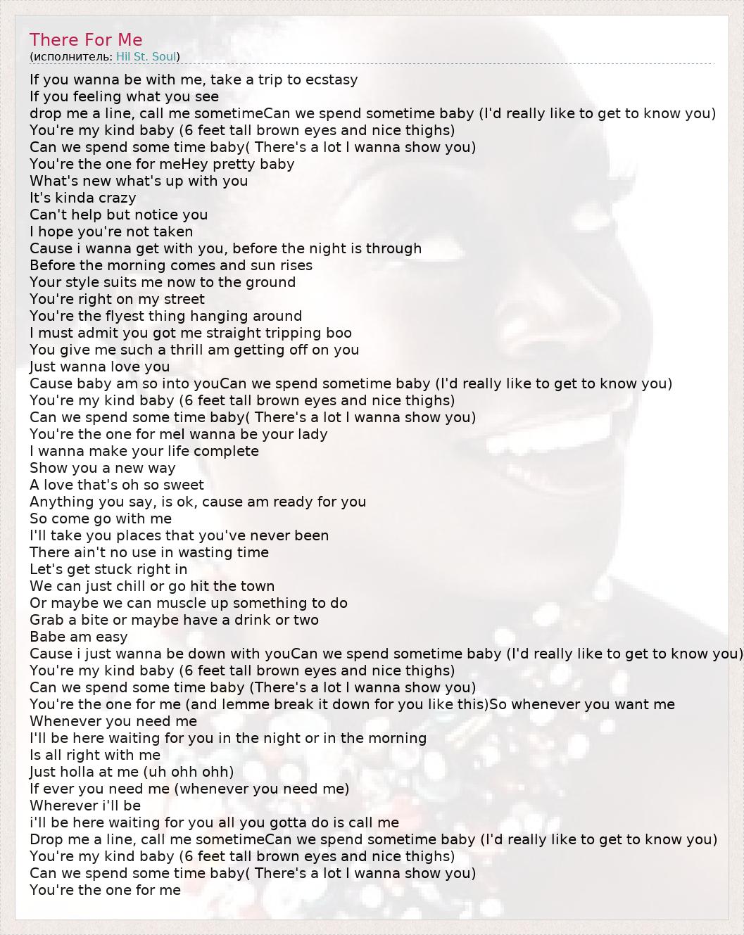 If you wanna be with me, take a trip to ecstasy If you feeling what you see drop me a line, call me sometimeCan we spend sometime baby (I'd really like to get to know you) You're my kind baby (6 feet tall brown eyes and nice thighs) Can we spend some time baby( There's a lot I wanna show you) You're the one for meHey pretty baby What's new what's up with you It's kinda crazy Can't help but notice you I hope you're not taken Cause i wanna get with you, before the night is through Before the morning comes and sun rises Your style suits me now to the ground You're right on my street You're the flyest thing hanging around I must admit you got me straight tripping boo You give me such a thrill am getting off on you Just wanna love you Cause baby am so into youCan we spend sometime baby (I'd really like to get to know you) You're my kind baby (6 feet tall brown eyes and nice thighs) Can we spend some time baby( There's a lot I wanna show you) You're the one for meI wanna be your lady I wanna make your life complete Show you a new way A love that's oh so sweet Anything you say, is ok, cause am ready for you So come go with me I'll take you places that you've never been There ain't no use in wasting time Let's get stuck right in We can just chill or go hit the town Or maybe we can muscle up something to do Grab a bite or maybe have a drink or two Babe am easy Cause i just wanna be down with youCan we spend sometime baby (I'd really like to get to know you) You're my kind baby (6 feet tall brown eyes and nice thighs) Can we spend some time baby (There's a lot I wanna show you) You're the one for me (and lemme break it down for you like this)So whenever you want me Whenever you need me I'll be here waiting for you in the night or in the morning Is all right with me Just holla at me (uh ohh ohh) If ever you need me (whenever you need me) Wherever i'll be i'll be here waiting for you all you gotta do is call me Drop me a line, call me sometimeCan we spend sometime baby (I'd really like to get to know you) You're my kind baby (6 feet tall brown eyes and nice thighs) Can we spend some time baby( There's a lot I wanna show you) You're the one for me