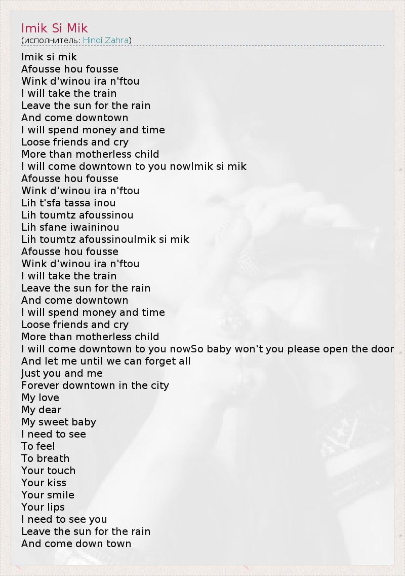 Imik si mik Afousse hou fousse Wink d'winou ira n'ftou I will take the train Leave the sun for the rain And come downtown I will spend money and time Loose friends and cry More than motherless child I will come downtown to you nowImik si mik Afousse hou fousse Wink d'winou ira n'ftou Lih t'sfa tassa inou Lih toumtz afoussinou Lih sfane iwaininou Lih toumtz afoussinouImik si mik Afousse hou fousse Wink d'winou ira n'ftou I will take the train Leave the sun for the rain And come downtown I will spend money and time Loose friends and cry More than motherless child I will come downtown to you nowSo baby won't you please open the door And let me until we can forget all Just you and me Forever downtown in the city My love My dear My sweet baby I need to see To feel To breath Your touch Your kiss Your smile Your lips I need to see you Leave the sun for the rain And come down town