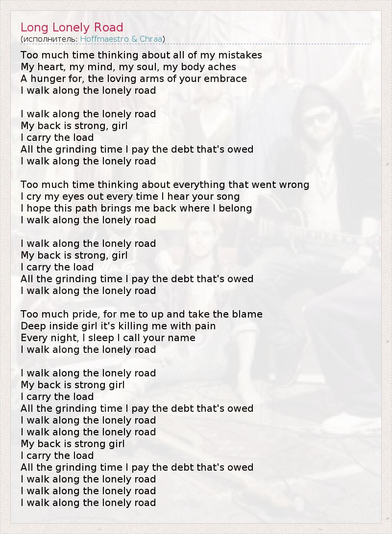 Слишком долго винил себя за все свои ошибки Мои сердце, душа, разум, тело - болят... Я изголодался по твоим любящим объятиям, Я бреду по одинокой дороге... Я бреду по одинокой дороге, Моя спина окрепла, девочка, Я несу на ней бремя... Все это время я плачу за свои ошибки, Я бреду по одинокой дороге... Слишком долго думал о том, что пошло не так. Каждый раз я рыдаю, слыша твою песню. Надеюсь, этот путь вернет меня туда, где сердце я оставил, Я бреду по одинокой дороге.... Я бреду по одинокой дороге, Моя спина окрепла, девочка, Я несу на ней бремя... Все это время я плачу за свои ошибки, Я бреду по одинокой дороге... Слишком горд, чтобы признать свою вину, - Глубоко в душе, девочка, меня убивает это... Каждую ночь во сне я зову тебя по имени, Я бреду по одинокой дороге.... Я бреду по одинокой дороге, Моя спина окрепла, девочка, Я несу на ней бремя... Все это время я плачу за свои ошибки, Я бреду по одинокой дороге... Я бреду по одинокой дороге, Моя спина окрепла, девочка, Я несу на ней бремя... Все это время я плачу за свои ошибки, Я бреду по одинокой дороге... Я бреду по одинокой дороге... Я бреду по одинокой дороге...