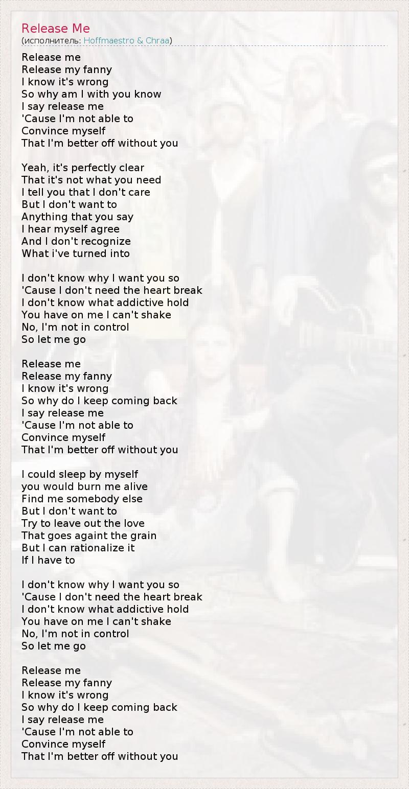 Release me Release my fanny I know it's wrong So why am I with you know I say release me 'Cause I'm not able to Convince myself That I'm better off without you Yeah, it's perfectly clear That it's not what you need I tell you that I don't care But I don't want to Anything that you say I hear myself agree And I don't recognize What i've turned into I don't know why I want you so 'Cause I don't need the heart break I don't know what addictive hold You have on me I can't shake No, I'm not in control So let me go Release me Release my fanny I know it's wrong So why do I keep coming back I say release me 'Cause I'm not able to Convince myself That I'm better off without you I could sleep by myself you would burn me alive Find me somebody else But I don't want to Try to leave out the love That goes againt the grain But I can rationalize it If I have to I don't know why I want you so 'Cause I don't need the heart break I don't know what addictive hold You have on me I can't shake No, I'm not in control So let me go Release me Release my fanny I know it's wrong So why do I keep coming back I say release me 'Cause I'm not able to Convince myself That I'm better off without you