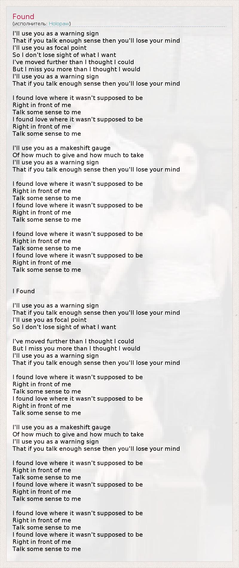Ты послужишь мне предупредительным знаком: Когда ты наговоришься по делу, у тебя начинает ехать крыша. Ты послужишь мне фокусной точкой, Чтобы я не сбился с цели. Я достиг большего, чем мог бы предположить, Но скучаю по тебе сильней, чем предполагал. Ты послужишь мне предупредительным знаком: Когда ты наговоришься по делу, у тебя начинает ехать крыша. Я нашёл любовь там, где её не должно было быть: Прямо перед собой, Образумь меня немного... Я нашёл любовь там, где её не должно было быть: Прямо перед собой, Образумь меня немного... Ты послужишь мне временной мерой Того, сколько отдавать и сколько брать взамен. Ты послужишь мне предупредительным знаком: Когда ты наговоришься по делу, у тебя начинает ехать крыша. Я нашёл любовь там, где её не должно было быть: Прямо перед собой, Образумь меня немного... Я нашёл любовь там, где её не должно было быть: Прямо перед собой, Образумь меня немного... Я нашёл любовь там, где её не должно было быть: Прямо перед собой, Образумь меня немного... Я нашёл любовь там, где её не должно было быть: Прямо перед собой, Образумь меня немного... Отыскал* (перевод Fab Flute) Будешь мне судьбоносный знак, Уча, что, перемудрив, лишь сойдёшь с ума. Будешь мне путеводный свет, Ориентир, где юг и север где. Сделал больше, чем помыслить смел, Только рвётся сердце моё к тебе. Будешь мне судьбоносный знак, Уча, что, перемудрив, лишь сойдёшь с ума. Отыскал там, где встретить её не ждал, Здесь любовь была, Ты мой щедрый дар. Отыскал там, где встретить её не ждал, Здесь любовь была, Ты мой щедрый дар. Будешь мне отправной чертой: Что отдавать и что брать с собой. Будешь мне судьбоносный знак, Уча, что, перемудрив, лишь сойдёшь с ума. Отыскал там, где встретить её не ждал, Здесь любовь была, Ты мой щедрый дар. Отыскал там, где встретить её не ждал, Здесь любовь была, Ты мой щедрый дар. Отыскал там, где встретить её не ждал, Здесь любовь была, Ты мой щедрый дар. Отыскал там, где встретить её не ждал, Здесь любовь была, Ты мой щедрый дар. * Поэтический (эквиритмический) перевод.