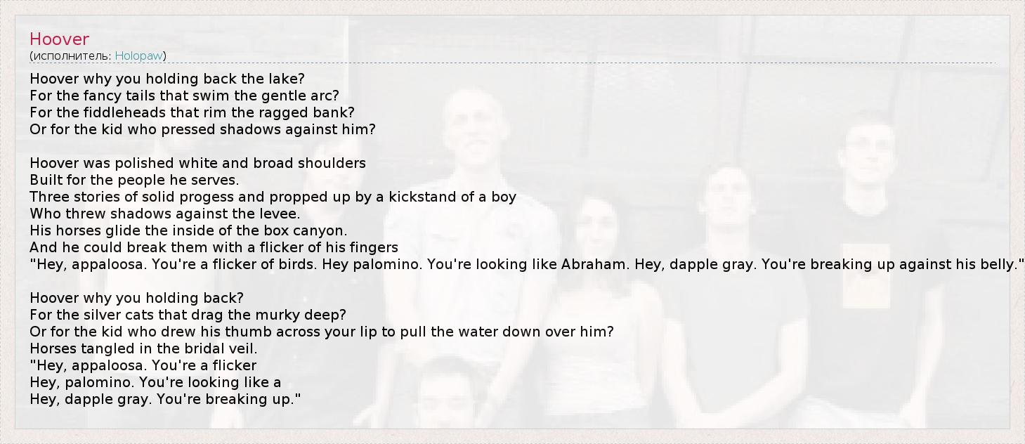 "Hey, appaloosa. You're a flicker of birds. Hey palomino. You're looking like Abraham. Hey, dapple gray. You're breaking up against his belly."