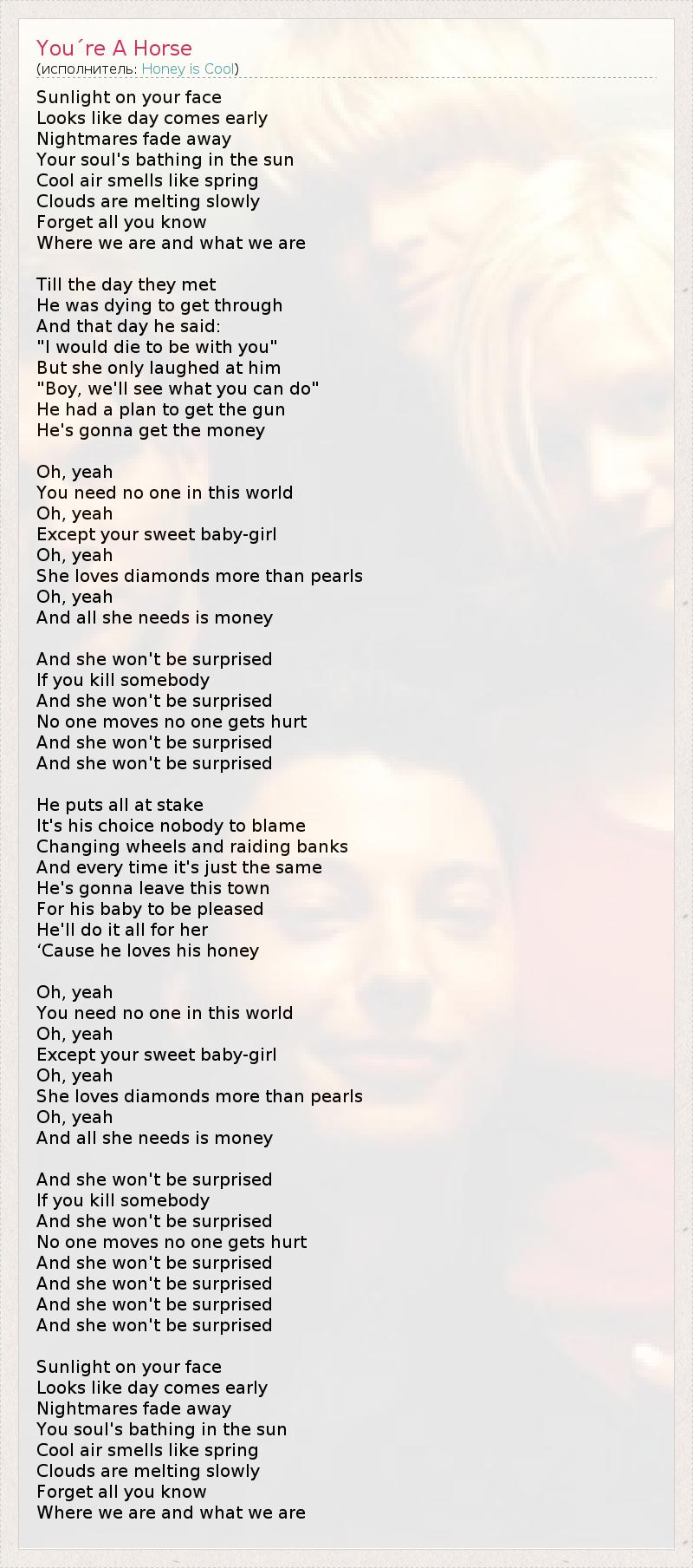 Sunlight on your face Looks like day comes early Nightmares fade away Your soul's bathing in the sun Cool air smells like spring Clouds are melting slowly Forget all you know Where we are and what we are Till the day they met He was dying to get through And that day he said: "I would die to be with you" But she only laughed at him "Boy, we'll see what you can do" He had a plan to get the gun He's gonna get the money Oh, yeah You need no one in this world Oh, yeah Except your sweet baby-girl Oh, yeah She loves diamonds more than pearls Oh, yeah And all she needs is money And she won't be surprised If you kill somebody And she won't be surprised No one moves no one gets hurt And she won't be surprised And she won't be surprised He puts all at stake It's his choice nobody to blame Changing wheels and raiding banks And every time it's just the same He's gonna leave this town For his baby to be pleased He'll do it all for her ‘Cause he loves his honey Oh, yeah You need no one in this world Oh, yeah Except your sweet baby-girl Oh, yeah She loves diamonds more than pearls Oh, yeah And all she needs is money And she won't be surprised If you kill somebody And she won't be surprised No one moves no one gets hurt And she won't be surprised And she won't be surprised And she won't be surprised And she won't be surprised Sunlight on your face Looks like day comes early Nightmares fade away You soul's bathing in the sun Cool air smells like spring Clouds are melting slowly Forget all you know Where we are and what we are