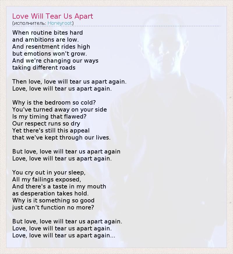When routine bites hard and ambitions are low. And resentment rides high but emotions won't grow. And we're changing our ways taking different roads Then love, love will tear us apart again. Love, love will tear us apart again. Why is the bedroom so cold? You've turned away on your side Is my timing that flawed? Our respect runs so dry Yet there's still this appeal that we've kept through our lives. But love, love will tear us apart again Love, love will tear us apart again. You cry out in your sleep, All my failings exposed, And there's a taste in my mouth as desperation takes hold. Why is it something so good just can't function no more? But love, love will tear us apart again. Love, love will tear us apart again. Love, love will tear us apart again...