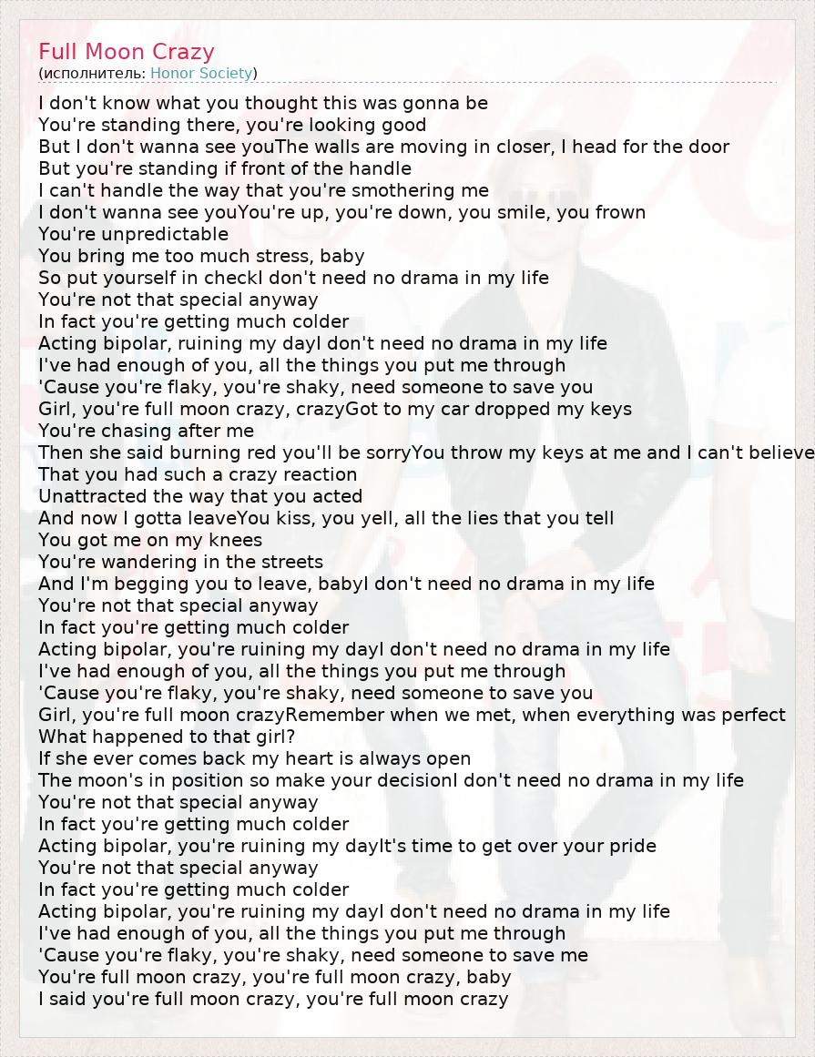 I don't know what you thought this was gonna be You're standing there, you're looking good But I don't wanna see youThe walls are moving in closer, I head for the door But you're standing if front of the handle I can't handle the way that you're smothering me I don't wanna see youYou're up, you're down, you smile, you frown You're unpredictable You bring me too much stress, baby So put yourself in checkI don't need no drama in my life You're not that special anyway In fact you're getting much colder Acting bipolar, ruining my dayI don't need no drama in my life I've had enough of you, all the things you put me through 'Cause you're flaky, you're shaky, need someone to save you Girl, you're full moon crazy, crazyGot to my car dropped my keys You're chasing after me Then she said burning red you'll be sorryYou throw my keys at me and I can't believe That you had such a crazy reaction Unattracted the way that you acted And now I gotta leaveYou kiss, you yell, all the lies that you tell You got me on my knees You're wandering in the streets And I'm begging you to leave, babyI don't need no drama in my life You're not that special anyway In fact you're getting much colder Acting bipolar, you're ruining my dayI don't need no drama in my life I've had enough of you, all the things you put me through 'Cause you're flaky, you're shaky, need someone to save you Girl, you're full moon crazyRemember when we met, when everything was perfect What happened to that girl? If she ever comes back my heart is always open The moon's in position so make your decisionI don't need no drama in my life You're not that special anyway In fact you're getting much colder Acting bipolar, you're ruining my dayIt's time to get over your pride You're not that special anyway In fact you're getting much colder Acting bipolar, you're ruining my dayI don't need no drama in my life I've had enough of you, all the things you put me through 'Cause you're flaky, you're shaky, need someone to save me You're full moon crazy, you're full moon crazy, baby I said you're full moon crazy, you're full moon crazy