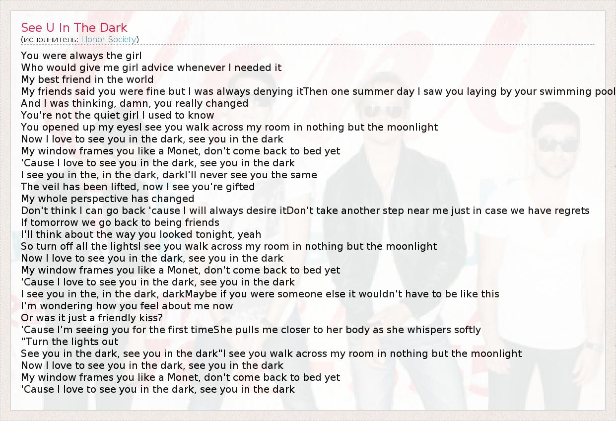 See you in the dark, see you in the dark"I see you walk across my room in nothing but the moonlight