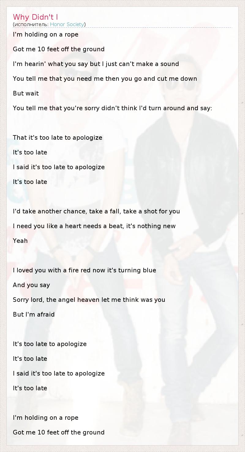 I'm holding on a rope Got me 10 feet off the ground I'm hearin' what you say but I just can't make a sound You tell me that you need me then you go and cut me down But wait You tell me that you're sorry didn't think I'd turn around and say: That it's too late to apologize It's too late I said it's too late to apologize It's too late I'd take another chance, take a fall, take a shot for you I need you like a heart needs a beat, it's nothing new Yeah I loved you with a fire red now it's turning blue And you say Sorry lord, the angel heaven let me think was you But I'm afraid It's too late to apologize It's too late I said it's too late to apologize It's too late I'm holding on a rope Got me 10 feet off the ground