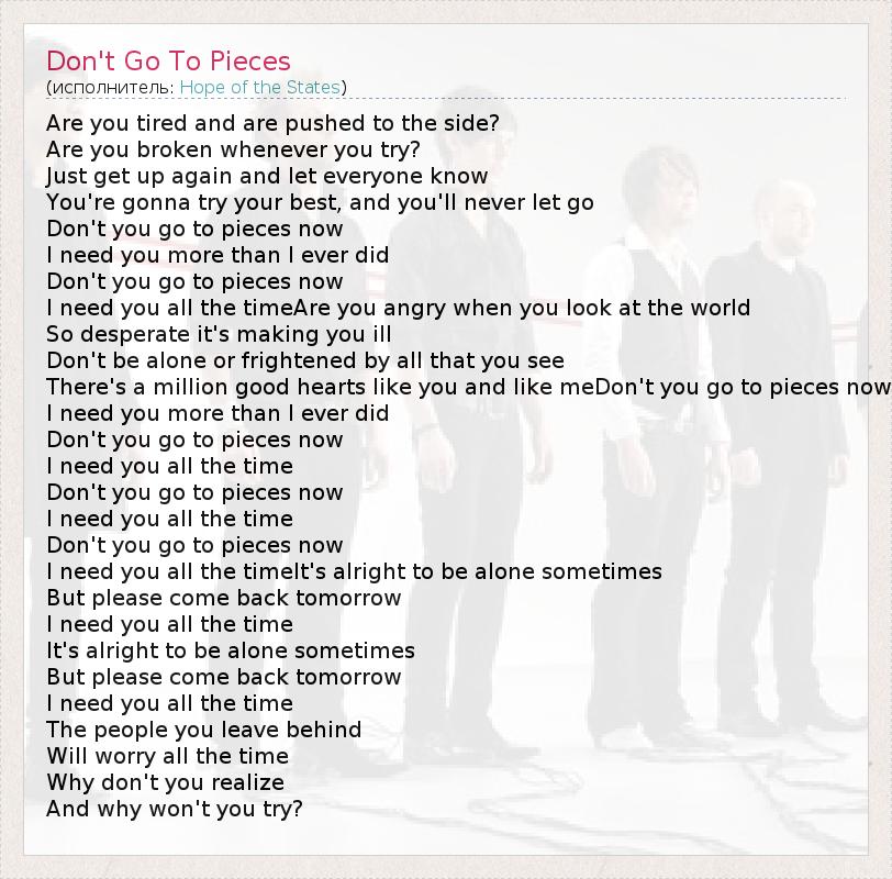 Are you tired and are pushed to the side? Are you broken whenever you try? Just get up again and let everyone know You're gonna try your best, and you'll never let go Don't you go to pieces now I need you more than I ever did Don't you go to pieces now I need you all the timeAre you angry when you look at the world So desperate it's making you ill Don't be alone or frightened by all that you see There's a million good hearts like you and like meDon't you go to pieces now I need you more than I ever did Don't you go to pieces now I need you all the time Don't you go to pieces now I need you all the time Don't you go to pieces now I need you all the timeIt's alright to be alone sometimes But please come back tomorrow I need you all the time It's alright to be alone sometimes But please come back tomorrow I need you all the time The people you leave behind Will worry all the time Why don't you realize And why won't you try?