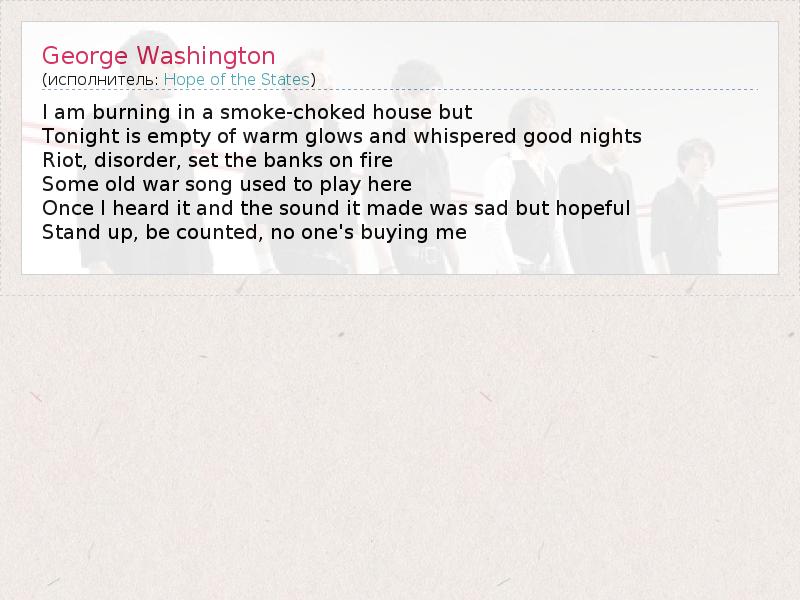 I am burning in a smoke-choked house but Tonight is empty of warm glows and whispered good nights Riot, disorder, set the banks on fire Some old war song used to play here Once I heard it and the sound it made was sad but hopeful Stand up, be counted, no one's buying me