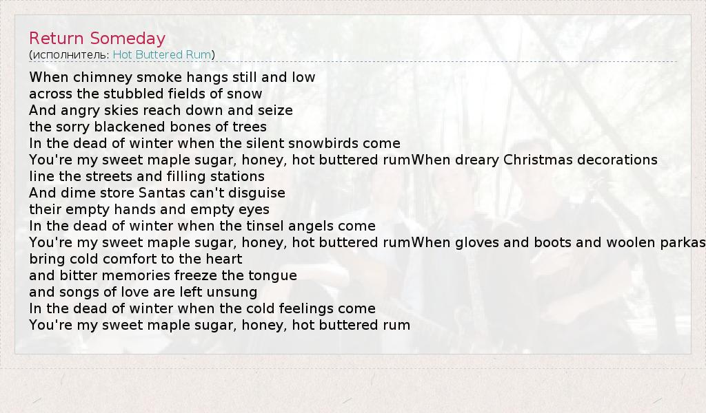 You're my sweet maple sugar, honey, hot buttered rumWhen dreary Christmas decorations