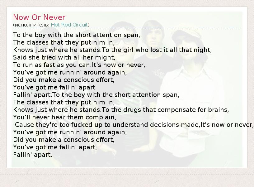 To the boy with the short attention span, The classes that they put him in, Knows just where he stands.To the girl who lost it all that night, Said she tried with all her might, To run as fast as you can.It's now or never, You've got me runnin' around again, Did you make a conscious effort, You've got me fallin' apart Fallin' apart.To the boy with the short attention span, The classes that they put him in, Knows just where he stands.To the drugs that compensate for brains, You'll never hear them complain, 'Cause they're too fucked up to understand decisions made,It's now or never, You've got me runnin' around again, Did you make a conscious effort, You've got me fallin' apart, Fallin' apart.