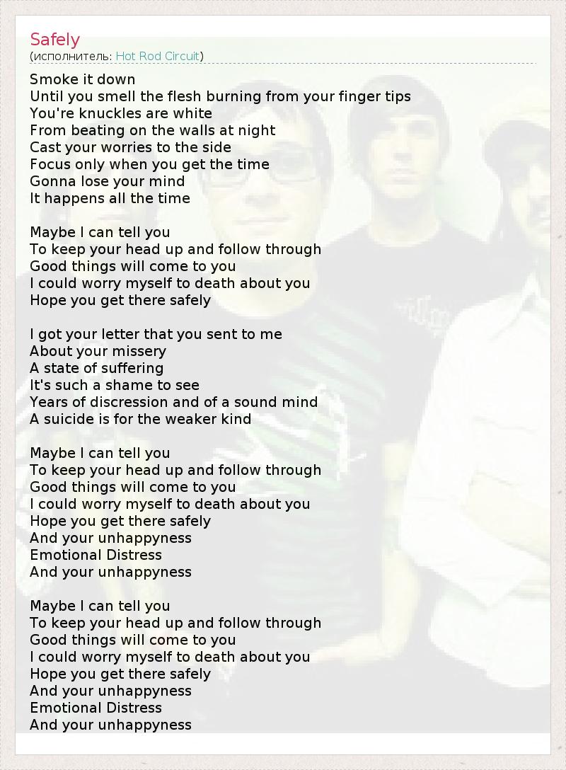 Дым его вниз Пока вы не пахнут плоть горела от кончиках пальцев Ты костяшки пальцев белые С бьется о стены ночью Cast ваши заботы в сторону Фокус только тогда, когда вы получаете время Собираюсь сойти с ума Это происходит все время Может быть, я могу вам сказать, Чтобы держать голову и выполнить Хорошие вещи приходят к вам Я мог бы беспокоиться себя до смерти о тебе Надеюсь, что вы получите там безопасно Я получил ваше письмо, которое вы послали мне Об missery Состояние страдающих Это такой позор, чтобы видеть Годы discression и целомудрия Самоубийство является для слабых вид Может быть, я могу вам сказать, Чтобы держать голову и выполнить Хорошие вещи приходят к вам Я мог бы беспокоиться себя до смерти о тебе Надеюсь, что вы получите там безопасно И ваш unhappyness Emotional Distress И ваш unhappyness Может быть, я могу вам сказать, Чтобы держать голову и выполнить Хорошие вещи приходят к вам Я мог бы беспокоиться себя до смерти о тебе Надеюсь, что вы получите там безопасно И ваш unhappyness Emotional Distress И ваш unhappyness