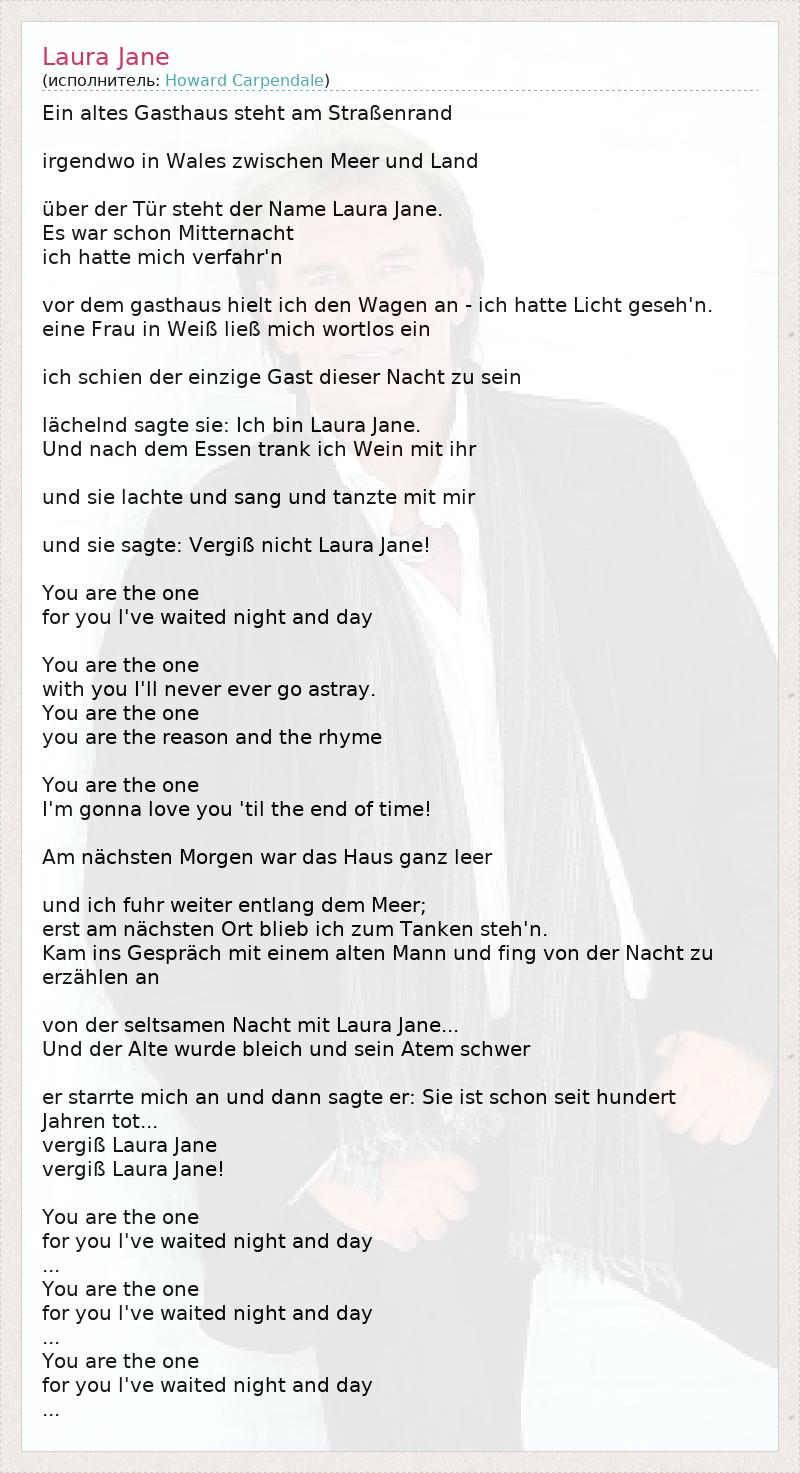 Ein altes Gasthaus steht am Straßenrand irgendwo in Wales zwischen Meer und Land über der Tür steht der Name Laura Jane. Es war schon Mitternacht ich hatte mich verfahr'n vor dem gasthaus hielt ich den Wagen an - ich hatte Licht geseh'n. eine Frau in Weiß ließ mich wortlos ein ich schien der einzige Gast dieser Nacht zu sein lächelnd sagte sie: Ich bin Laura Jane. Und nach dem Essen trank ich Wein mit ihr und sie lachte und sang und tanzte mit mir und sie sagte: Vergiß nicht Laura Jane! You are the one for you l've waited night and day You are the one with you I'll never ever go astray. You are the one you are the reason and the rhyme You are the one I'm gonna love you 'til the end of time! Am nächsten Morgen war das Haus ganz leer und ich fuhr weiter entlang dem Meer; erst am nächsten Ort blieb ich zum Tanken steh'n. Kam ins Gespräch mit einem alten Mann und fing von der Nacht zu erzählen an von der seltsamen Nacht mit Laura Jane... Und der Alte wurde bleich und sein Atem schwer er starrte mich an und dann sagte er: Sie ist schon seit hundert Jahren tot... vergiß Laura Jane vergiß Laura Jane! You are the one for you l've waited night and day ... You are the one for you l've waited night and day ... You are the one for you l've waited night and day ...