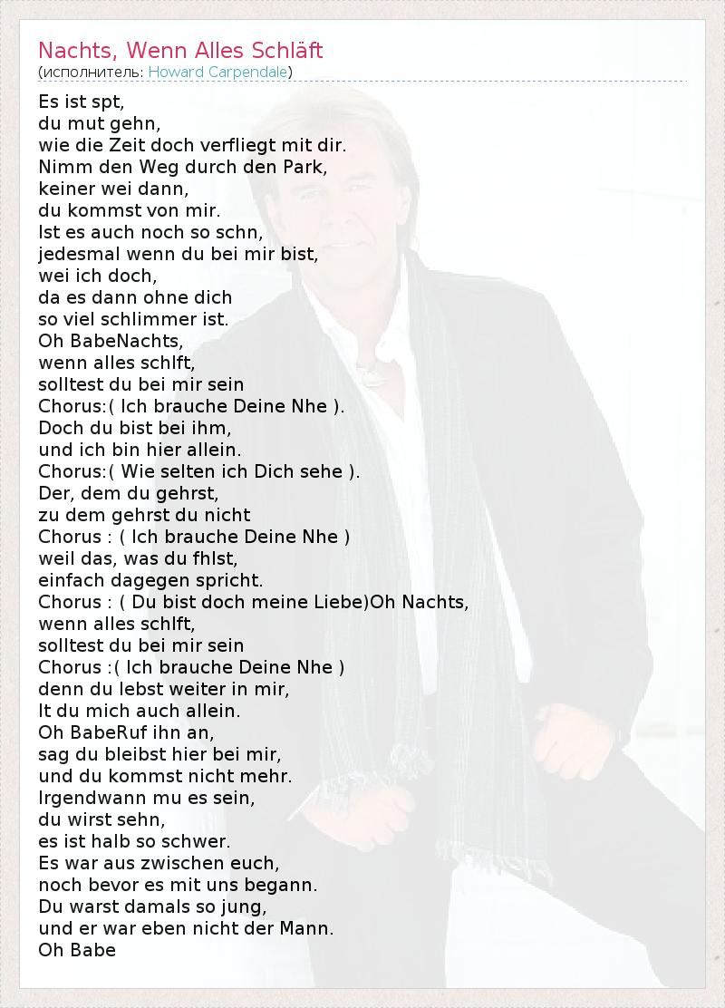 Es ist spt, du mut gehn, wie die Zeit doch verfliegt mit dir. Nimm den Weg durch den Park, keiner wei dann, du kommst von mir. Ist es auch noch so schn, jedesmal wenn du bei mir bist, wei ich doch, da es dann ohne dich so viel schlimmer ist. Oh BabeNachts, wenn alles schlft, solltest du bei mir sein Chorus:( Ich brauche Deine Nhe ). Doch du bist bei ihm, und ich bin hier allein. Chorus:( Wie selten ich Dich sehe ). Der, dem du gehrst, zu dem gehrst du nicht Chorus : ( Ich brauche Deine Nhe ) weil das, was du fhlst, einfach dagegen spricht. Chorus : ( Du bist doch meine Liebe)Oh Nachts, wenn alles schlft, solltest du bei mir sein Chorus :( Ich brauche Deine Nhe ) denn du lebst weiter in mir, lt du mich auch allein. Oh BabeRuf ihn an, sag du bleibst hier bei mir, und du kommst nicht mehr. Irgendwann mu es sein, du wirst sehn, es ist halb so schwer. Es war aus zwischen euch, noch bevor es mit uns begann. Du warst damals so jung, und er war eben nicht der Mann. Oh Babe