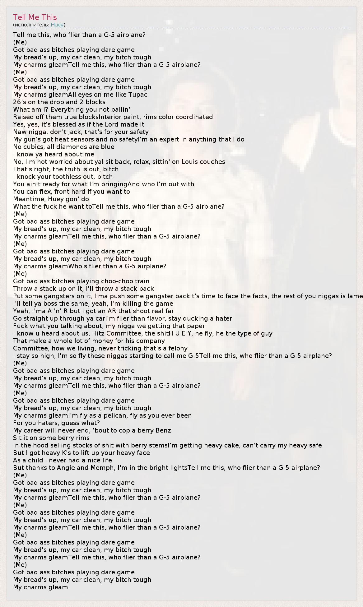 Это интересно:St. Louis rapper Huey (aka Baby Huey) started dropping beats with a friend on his neighborhood block of Arlington Ave. during his mid-teens, taking inspiration from fellow Dirty South stars like Chingy, Nelly, and Ludacris. Writing songs was something fun to do, but when Huey's older brother brought in music veteran Angela Richardson, Huey's ambitions became more serious. Richardson was cultivating a rap group at the time, and it wasn't long until Huey's sharp-witted rhymes became front and center. Songs such as "Oh" and "Pop, Lock & Drop It" became local favorites among DJs and promoters, further pushing Huey's mixtapes into college campuses and other... продолжение