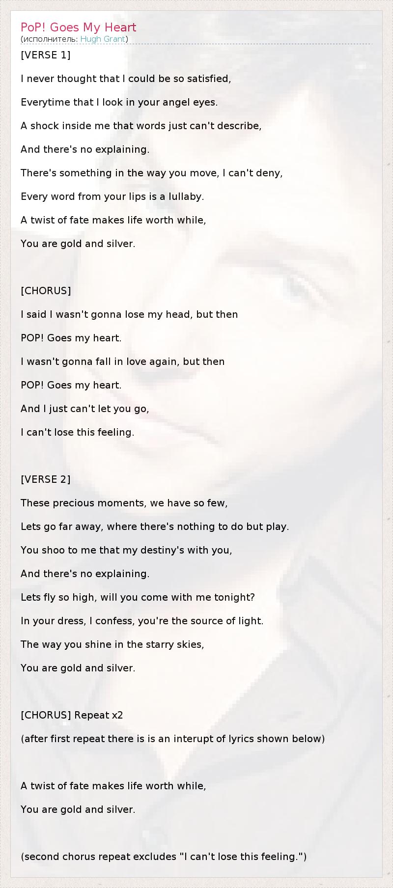 [VERSE 1] I never thought that I could be so satisfied, Everytime that I look in your angel eyes. A shock inside me that words just can't describe, And there's no explaining. There's something in the way you move, I can't deny, Every word from your lips is a lullaby. A twist of fate makes life worth while, You are gold and silver. [CHORUS] I said I wasn't gonna lose my head, but then POP! Goes my heart. I wasn't gonna fall in love again, but then POP! Goes my heart. And I just can't let you go, I can't lose this feeling. [VERSE 2] These precious moments, we have so few, Lets go far away, where there's nothing to do but play. You shoo to me that my destiny's with you, And there's no explaining. Lets fly so high, will you come with me tonight? In your dress, I confess, you're the source of light. The way you shine in the starry skies, You are gold and silver. [CHORUS] Repeat x2 (after first repeat there is is an interupt of lyrics shown below) A twist of fate makes life worth while, You are gold and silver. (second chorus repeat excludes "I can't lose this feeling.")