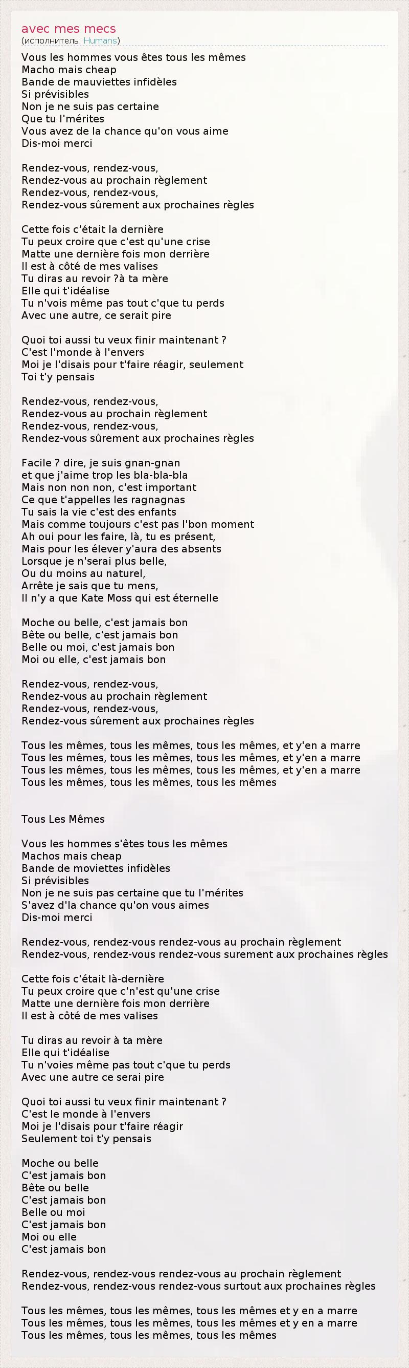 Vous les hommes vous êtes tous les mêmes Macho mais cheap Bande de mauviettes infidèles Si prévisibles Non je ne suis pas certaine Que tu l'mérites Vous avez de la chance qu'on vous aime Dis-moi merci Rendez-vous, rendez-vous, Rendez-vous au prochain règlement Rendez-vous, rendez-vous, Rendez-vous sûrement aux prochaines règles Cette fois c'était la dernière Tu peux croire que c'est qu'une crise Matte une dernière fois mon derrière Il est à côté de mes valises Tu diras au revoir ?à ta mère Elle qui t'idéalise Tu n'vois même pas tout c'que tu perds Avec une autre, ce serait pire Quoi toi aussi tu veux finir maintenant ? C'est l'monde à l'envers Moi je l'disais pour t'faire réagir, seulement Toi t'y pensais Rendez-vous, rendez-vous, Rendez-vous au prochain règlement Rendez-vous, rendez-vous, Rendez-vous sûrement aux prochaines règles Facile ? dire, je suis gnan-gnan et que j'aime trop les bla-bla-bla Mais non non non, c'est important Ce que t'appelles les ragnagnas Tu sais la vie c'est des enfants Mais comme toujours c'est pas l'bon moment Ah oui pour les faire, là, tu es présent, Mais pour les élever y'aura des absents Lorsque je n'serai plus belle, Ou du moins au naturel, Arrête je sais que tu mens, Il n'y a que Kate Moss qui est éternelle Moche ou belle, c'est jamais bon Bête ou belle, c'est jamais bon Belle ou moi, c'est jamais bon Moi ou elle, c'est jamais bon Rendez-vous, rendez-vous, Rendez-vous au prochain règlement Rendez-vous, rendez-vous, Rendez-vous sûrement aux prochaines règles Tous les mêmes, tous les mêmes, tous les mêmes, et y'en a marre Tous les mêmes, tous les mêmes, tous les mêmes, et y'en a marre Tous les mêmes, tous les mêmes, tous les mêmes, et y'en a marre Tous les mêmes, tous les mêmes, tous les mêmes Tous Les Mêmes Vous les hommes s'êtes tous les mêmes Machos mais cheap Bande de moviettes infidèles Si prévisibles Non je ne suis pas certaine que tu l'mérites S'avez d'la chance qu'on vous aimes Dis-moi merci Rendez-vous, rendez-vous rendez-vous au prochain règlement Rendez-vous, rendez-vous rendez-vous surement aux prochaines règles Cette fois c'était là-dernière Tu peux croire que c'n'est qu'une crise Matte une dernière fois mon derrière Il est à côté de mes valises Tu diras au revoir à ta mère Elle qui t'idéalise Tu n'voies même pas tout c'que tu perds Avec une autre ce serai pire Quoi toi aussi tu veux finir maintenant ? C'est le monde à l'envers Moi je l'disais pour t'faire réagir Seulement toi t'y pensais Moche ou belle C'est jamais bon Bête ou belle C'est jamais bon Belle ou moi C'est jamais bon Moi ou elle C'est jamais bon Rendez-vous, rendez-vous rendez-vous au prochain règlement Rendez-vous, rendez-vous rendez-vous surtout aux prochaines règles Tous les mêmes, tous les mêmes, tous les mêmes et y en a marre Tous les mêmes, tous les mêmes, tous les mêmes et y en a marre Tous les mêmes, tous les mêmes, tous les mêmes