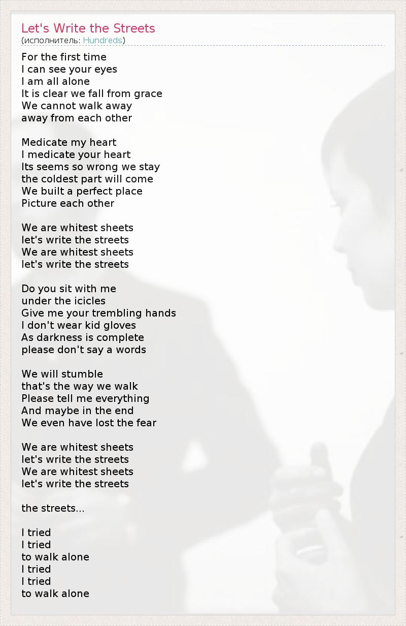 For the first time I can see your eyes I am all alone It is clear we fall from grace We cannot walk away away from each other Medicate my heart I medicate your heart Its seems so wrong we stay the coldest part will come We built a perfect place Picture each other We are whitest sheets let's write the streets We are whitest sheets let's write the streets Do you sit with me under the icicles Give me your trembling hands I don't wear kid gloves As darkness is complete please don't say a words We will stumble that's the way we walk Please tell me everything And maybe in the end We even have lost the fear We are whitest sheets let's write the streets We are whitest sheets let's write the streets the streets... I tried I tried to walk alone I tried I tried to walk alone