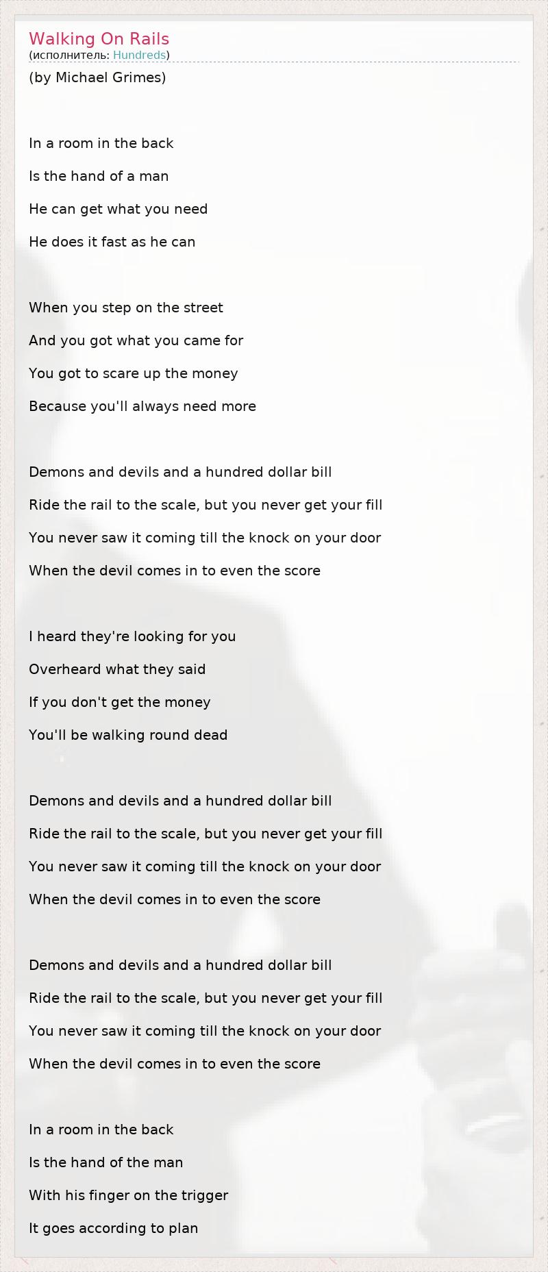 (by Michael Grimes) In a room in the back Is the hand of a man He can get what you need He does it fast as he can When you step on the street And you got what you came for You got to scare up the money Because you'll always need more Demons and devils and a hundred dollar bill Ride the rail to the scale, but you never get your fill You never saw it coming till the knock on your door When the devil comes in to even the score I heard they're looking for you Overheard what they said If you don't get the money You'll be walking round dead Demons and devils and a hundred dollar bill Ride the rail to the scale, but you never get your fill You never saw it coming till the knock on your door When the devil comes in to even the score Demons and devils and a hundred dollar bill Ride the rail to the scale, but you never get your fill You never saw it coming till the knock on your door When the devil comes in to even the score In a room in the back Is the hand of the man With his finger on the trigger It goes according to plan