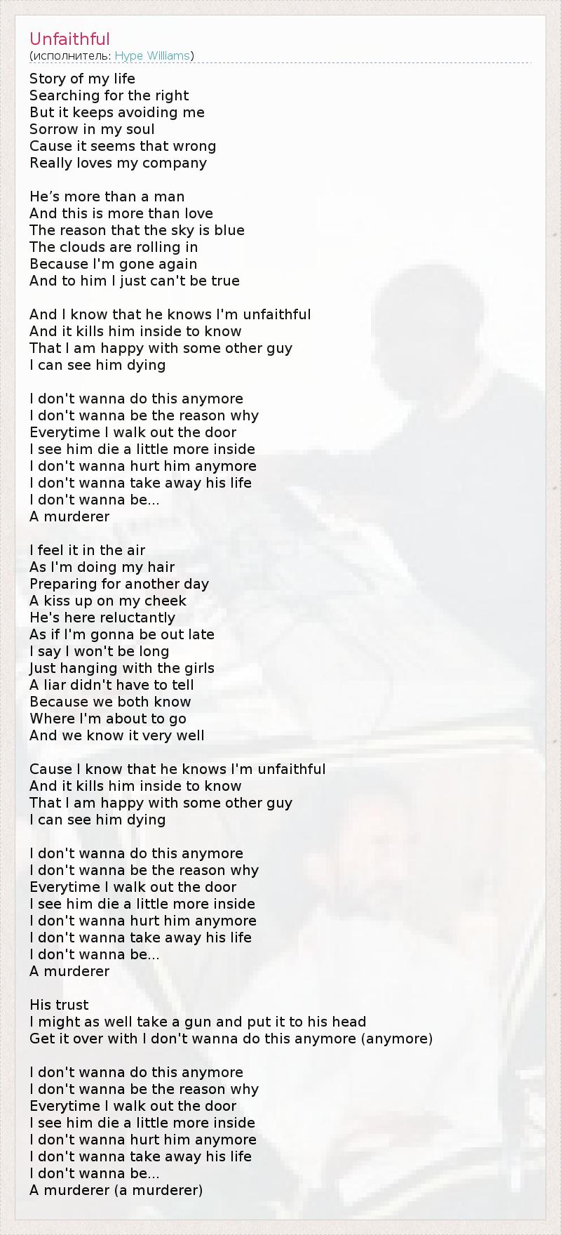 Story of my life Searching for the right But it keeps avoiding me Sorrow in my soul Cause it seems that wrong Really loves my company He’s more than a man And this is more than love The reason that the sky is blue The clouds are rolling in Because I'm gone again And to him I just can't be true And I know that he knows I'm unfaithful And it kills him inside to know That I am happy with some other guy I can see him dying I don't wanna do this anymore I don't wanna be the reason why Everytime I walk out the door I see him die a little more inside I don't wanna hurt him anymore I don't wanna take away his life I don't wanna be... A murderer I feel it in the air As I'm doing my hair Preparing for another day A kiss up on my cheek He's here reluctantly As if I'm gonna be out late I say I won't be long Just hanging with the girls A liar didn't have to tell Because we both know Where I'm about to go And we know it very well Cause I know that he knows I'm unfaithful And it kills him inside to know That I am happy with some other guy I can see him dying I don't wanna do this anymore I don't wanna be the reason why Everytime I walk out the door I see him die a little more inside I don't wanna hurt him anymore I don't wanna take away his life I don't wanna be... A murderer His trust I might as well take a gun and put it to his head Get it over with I don't wanna do this anymore (anymore) I don't wanna do this anymore I don't wanna be the reason why Everytime I walk out the door I see him die a little more inside I don't wanna hurt him anymore I don't wanna take away his life I don't wanna be... A murderer (a murderer)