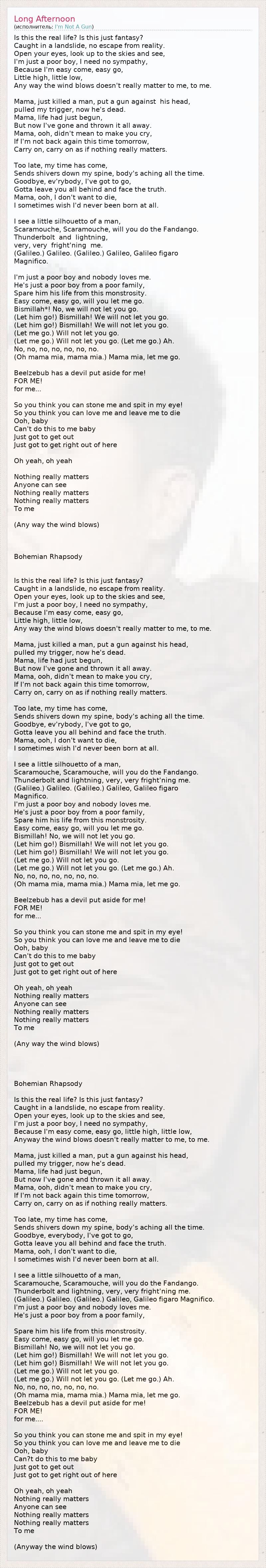 Is this the real life? Is this just fantasy? Caught in a landslide, no escape from reality. Open your eyes, look up to the skies and see, I'm just a poor boy, I need no sympathy, Because I'm easy come, easy go, Little high, little low, Any way the wind blows doesn't really matter to me, to me. Mama, just killed a man, put a gun against his head, pulled my trigger, now he's dead. Mama, life had just begun, But now I've gone and thrown it all away. Mama, ooh, didn't mean to make you cry, If I'm not back again this time tomorrow, Carry on, carry on as if nothing really matters. Too late, my time has come, Sends shivers down my spine, body's aching all the time. Goodbye, ev'rybody, I've got to go, Gotta leave you all behind and face the truth. Mama, ooh, I don't want to die, I sometimes wish I'd never been born at all. I see a little silhouetto of a man, Scaramouche, Scaramouche, will you do the Fandango. Thunderbolt and lightning, very, very fright'ning me. (Galileo.) Galileo. (Galileo.) Galileo, Galileo figaro Magnifico. I'm just a poor boy and nobody loves me. He's just a poor boy from a poor family, Spare him his life from this monstrosity. Easy come, easy go, will you let me go. Bismillah*! No, we will not let you go. (Let him go!) Bismillah! We will not let you go. (Let him go!) Bismillah! We will not let you go. (Let me go.) Will not let you go. (Let me go.) Will not let you go. (Let me go.) Ah. No, no, no, no, no, no, no. (Oh mama mia, mama mia.) Mama mia, let me go. Beelzebub has a devil put aside for me! FOR ME! for me... So you think you can stone me and spit in my eye! So you think you can love me and leave me to die Ooh, baby Can't do this to me baby Just got to get out Just got to get right out of here Oh yeah, oh yeah Nothing really matters Anyone can see Nothing really matters Nothing really matters To me (Any way the wind blows) Bohemian Rhapsody Is this the real life? Is this just fantasy? Caught in a landslide, no escape from reality. Open your eyes, look up to the skies and see, I'm just a poor boy, I need no sympathy, Because I'm easy come, easy go, Little high, little low, Any way the wind blows doesn't really matter to me, to me. Mama, just killed a man, put a gun against his head, pulled my trigger, now he's dead. Mama, life had just begun, But now I've gone and thrown it all away. Mama, ooh, didn't mean to make you cry, If I'm not back again this time tomorrow, Carry on, carry on as if nothing really matters. Too late, my time has come, Sends shivers down my spine, body's aching all the time. Goodbye, ev'rybody, I've got to go, Gotta leave you all behind and face the truth. Mama, ooh, I don't want to die, I sometimes wish I'd never been born at all. I see a little silhouetto of a man, Scaramouche, Scaramouche, will you do the Fandango. Thunderbolt and lightning, very, very fright'ning me. (Galileo.) Galileo. (Galileo.) Galileo, Galileo figaro Magnifico. I'm just a poor boy and nobody loves me. He's just a poor boy from a poor family, Spare him his life from this monstrosity. Easy come, easy go, will you let me go. Bismillah! No, we will not let you go. (Let him go!) Bismillah! We will not let you go. (Let him go!) Bismillah! We will not let you go. (Let me go.) Will not let you go. (Let me go.) Will not let you go. (Let me go.) Ah. No, no, no, no, no, no, no. (Oh mama mia, mama mia.) Mama mia, let me go. Beelzebub has a devil put aside for me! FOR ME! for me... So you think you can stone me and spit in my eye! So you think you can love me and leave me to die Ooh, baby Can't do this to me baby Just got to get out Just got to get right out of here Oh yeah, oh yeah Nothing really matters Anyone can see Nothing really matters Nothing really matters To me (Any way the wind blows) Bohemian Rhapsody Is this the real life? Is this just fantasy? Caught in a landslide, no escape from reality. Open your eyes, look up to the skies and see, I'm just a poor boy, I need no sympathy, Because I'm easy come, easy go, little high, little low, Anyway the wind blows doesn't really matter to me, to me. Mama, just killed a man, put a gun against his head, pulled my trigger, now he's dead. Mama, life had just begun, But now I've gone and thrown it all away. Mama, ooh, didn't mean to make you cry, If I'm not back again this time tomorrow, Carry on, carry on as if nothing really matters. Too late, my time has come, Sends shivers down my spine, body's aching all the time. Goodbye, everybody, I've got to go, Gotta leave you all behind and face the truth. Mama, ooh, I don't want to die, I sometimes wish I'd never been born at all. I see a little silhouetto of a man, Scaramouche, Scaramouche, will you do the Fandango. Thunderbolt and lightning, very, very fright'ning me. (Galileo.) Galileo. (Galileo.) Galileo, Galileo figaro Magnifico. I'm just a poor boy and nobody loves me. He's just a poor boy from a poor family, Spare him his life from this monstrosity. Easy come, easy go, will you let me go. Bismillah! No, we will not let you go. (Let him go!) Bismillah! We will not let you go. (Let him go!) Bismillah! We will not let you go. (Let me go.) Will not let you go. (Let me go.) Will not let you go. (Let me go.) Ah. No, no, no, no, no, no, no. (Oh mama mia, mama mia.) Mama mia, let me go. Beelzebub has a devil put aside for me! FOR ME! for me.... So you think you can stone me and spit in my eye! So you think you can love me and leave me to die Ooh, baby Can?t do this to me baby Just got to get out Just got to get right out of here Oh yeah, oh yeah Nothing really matters Anyone can see Nothing really matters Nothing really matters To me (Anyway the wind blows)