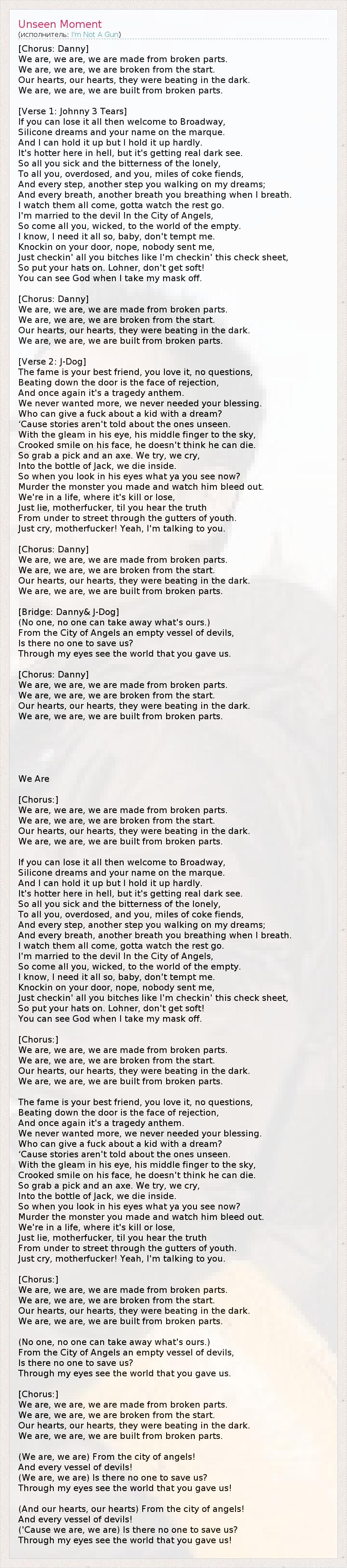 [Припев: Danny] Мы, мы, мы сделаны из обломков. Наши судьбы, наши судьбы были изломаны с самого начала. Наши сердца, наши сердца, они бились в темноте. Мы, мы, мы собраны из обломков. [Куплет 1: Johnny 3 Tears] Если ты способен потерять всё, то добро пожаловать на Бродвей, Здесь царят силиконовые мечты и на пропуске во вседозволенность – твоё имя. Я могу всё это сдерживать, но едва ли удастся. Здесь жарче, чем в аду, лишь только взор застит тьма. Вы больны и вся горечь одиночества достаётся Вам, передозникам, и вам, километровым шеренгам кокаиновых нелюдей, Все шаги, что вы сделали, пришлись по моим мечтам, И все вдохи, что вы сделали, вы отняли у меня. Я видел, как вы приходили, и должен дождаться момента, когда уйдёте. В Городе Ангелов я женат на Дьяволе, Все вы, грешники, проходите в мир пустоты. Я знаю: мне нужно всё, так что не искушайте меня. Я стучу в вашу дверь, но, нет, меня никто не звал, Я просто оценю ваших шл** так же, как оцениваю свои чеки, Надевайте свои шапки и на выход. Лёнер, 1 не подпускай мягкотелости! Когда я сдёргиваю маску, вы видите лик Бога. [Припев: Danny] Мы, мы, мы сделаны из обломков. Наши судьбы, наши судьбы были изломаны с самого начала. Наши сердца, наши сердца, они бились в темноте. Мы, мы, мы собраны из обломков. [Куплет 2: J-Dog] Слава – твоя лучшая подруга и ты её любишь, без вопросов, Выломанная дверь – это облик непринятия, И, к тому же, это гимн трагедии. Нам никогда не хотелось большего и не было нужно твоего одобрения. Кого бы, б**дь, волновал пацанчик со своими мечтами? Только ведь в историях говорится о реальных людях. С блеском в глазах он воздел к небу средний палец, На его лице ухмылка: он думает, что не умрёт. Так хватайтесь за мотыги. Мы пытаемся так, что кричим от натуги, Мы умираем внутри бутылки с виски. Когда вы смотрите ему в глаза, что видите вы в них сейчас? Убейте чудовище, которое вы сотворили, и наблюдайте за его страданиями. В нашей жизни так: убей или умри, Продолжай лгать, козлина, до тех пор, пока не услышишь правду, Выплеснувшуюся из подполья на улицы через молодёжь трущоб. Вот теперь кричи, ублюдок! Да, я говорю с тобой. [Припев: Danny] Мы, мы, мы сделаны из обломков. Наши судьбы, наши судьбы были изломаны с самого начала. Наши сердца, наши сердца, они бились в темноте. Мы, мы, мы собраны из обломков. [Переход: Danny и J-Dog] (Никому, никому не под силу отнять то, что принадлежит нам.) Пустое судно дьяволов идёт из Города Ангелов, Здесь нет никого, кто бы спас нас? Посмотрите моими глазами на мир, который вы для нас создали. [Припев: Danny] Мы, мы, мы сделаны из обломков. Наши судьбы, наши судьбы были изломаны с самого начала. Наши сердца, наши сердца, они бились в темноте. Мы, мы, мы собраны из обломков. 1 – Дэнни Лёнер – американский рок-музыкант; продюсер данной композиции. Мы ведь (перевод Камидзу Ташими из Львова) [Припев:] Мы ведь, мы ведь, мы из сломанных частей Мы ведь, мы ведь, мы живем у тебя во сне Наши сердца, они бьются в пустоту Ведь мы, ведь мы, мы сделаны в аду Если потеряешь все, милости просим на Бродвей Где мечты из силикона и полно чужих идей И я еле держусь, но будет еще труднее Жарче, чем в аду и гораздо темнее Здесь все больны, а одиночество заразно Отъехали вы так далеко друг от друга напрасно И каждый шаг с пылью мечты мои мешает Любое же дыхание только воздух загрязняет Я видел, как они приходили и шли тут же, сразу, Породниться ведь никто не хотел с той