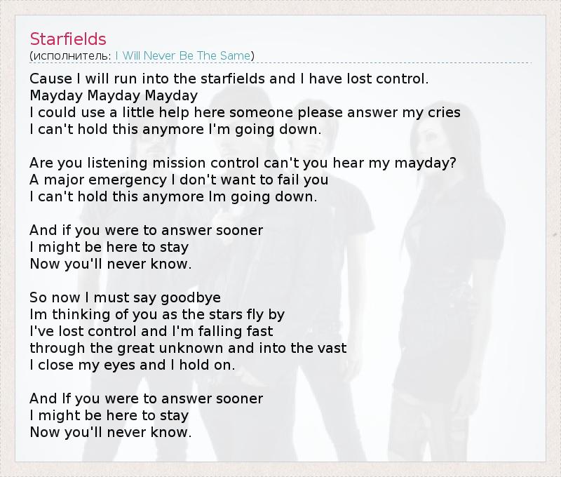 Cause I will run into the starfields and I have lost control. Mayday Mayday Mayday I could use a little help here someone please answer my cries I can't hold this anymore I'm going down. Are you listening mission control can't you hear my mayday? A major emergency I don't want to fail you I can't hold this anymore Im going down. And if you were to answer sooner I might be here to stay Now you'll never know. So now I must say goodbye Im thinking of you as the stars fly by I've lost control and I'm falling fast through the great unknown and into the vast I close my eyes and I hold on. And If you were to answer sooner I might be here to stay Now you'll never know.