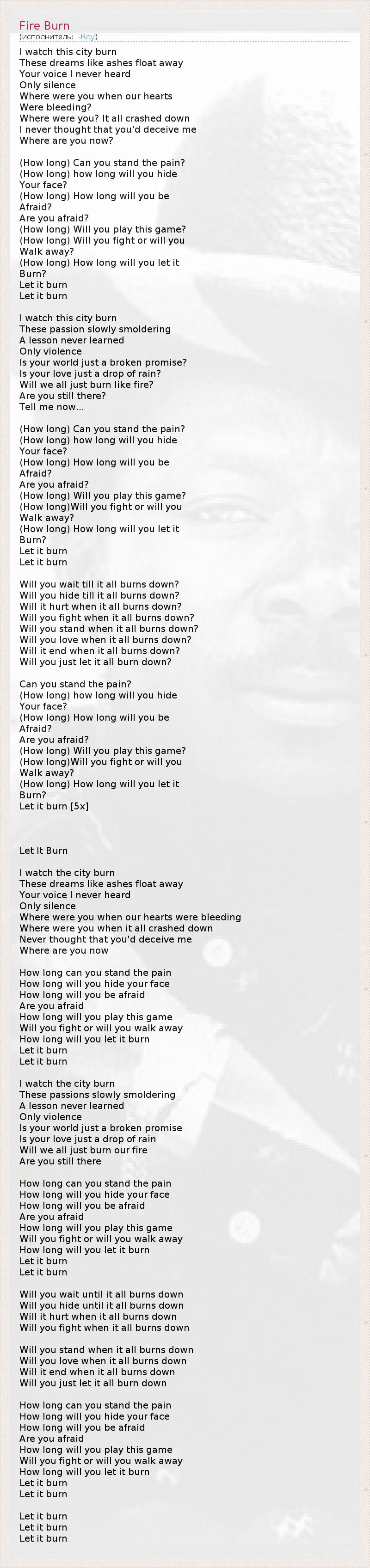 Я вижу этот полыхающий город, Эти грёзы, как пепел уплывающие прочь... Я никогда не слышал твоего голоса, Только тишину. Где ты был, когда наши сердца Кровоточили? Где ты был? Все рухнуло. Я помыслить не мог, что ты меня обманешь. Где ты сейчас? (Как долго) ты сможешь терпеть эту боль? (Как долго) как долго ты сможешь прятать Свое лицо? (Как долго) как долго ты будешь Бояться? Боишься ли ты? (Как долго) ты будешь играть в эту игру? (Как долго) будешь ли ты бороться или просто Уйдешь прочь? (Как долго) как долго ты позволишь пламени Гореть? Позволишь пламени гореть, Позволишь пламени гореть... Я вижу этот полыхающий город, Эти медленно тлеющие страсти. Урок так и не был выучен, Только насилие. Твой мир - просто нарушенное обещание? Твоя любовь - лишь капля дождя? Мы все будем пылать, как пламя? Ты все еще здесь? Скажи мне сейчас... (Как долго) ты сможешь терпеть эту боль? (Как долго) как долго ты сможешь прятать Свое лицо? (Как долго) как долго ты будешь Бояться? Боишься ли ты? (Как долго) ты будешь играть в эту игру? (Как долго) будешь ли ты бороться или просто Уйдешь прочь? (Как долго) как долго ты позволишь пламени Гореть? Позволишь пламени гореть, Позволишь пламени гореть... Будешь ли ты ждать, пока он не сгорит дотла? Будешь ли ты прятаться, пока он не сгорит дотла? Тебе будет больно, когда он сгорит дотла? Будешь ли ты бороться, когда он сгорит дотла? Устоишь ли ты на ногах, когда он сгорит дотла? Будешь ли ты любить, когда он сгорит дотла? Закончится ли все, когда он сгорит дотла? Позволишь ли ты просто сгореть ему дотла? Ты сможешь терпеть эту боль? (Как долго) как долго ты сможешь прятать Свое лицо? (Как долго) как долго ты будешь Бояться? Боишься ли ты? (Как долго) ты будешь играть в эту игру? (Как долго) будешь ли ты бороться или просто Уйдешь прочь? (Как долго) как долго ты позволишь пламени Гореть? Позволишь пламени гореть... [5x] Позволяешь всему гореть (перевод Владислав Быченков из Москвы) Я смотрю, как город пылает, Эти сны разлетаются, подобно пеплу. Я никогда не слышал твой голос, Лишь тишину. Где ты была, когда наши сердца тонули в крови? Где ты была, когда всё рухнуло? Никогда не думал, что ты солжешь мне, Где ты сейчас? Как долго ты будешь терпеть боль? Как долго ты будешь прятать своё лицо? Как долго ты еще будешь бояться? Боишься ли ты? Как долго тебе предстоит играть в эту игру? Будешь ли ты бороться или просто уйдешь? Как долго ты еще будешь позволять всему гореть? Гореть, Гореть... Я смотрю, как город пылает, Все страсти медленно тлеют. Урок никогда не будет усвоен, Только жестокость. Твой мир - лишь нарушенное обещание? Твоя любовь - капля боли? Сгорим ли мы попросту? Здесь ли ты еще? Как долго ты будешь терпеть боль? Как долго ты будешь прятать своё лицо? Как долго ты еще будешь бояться? Боишься ли ты? Как долго тебе предстоит играть в эту игру? Будешь ли ты бороться или просто уйдешь? Как долго ты еще будешь позволять всему гореть? Гореть, Гореть... Ты будешь ждать, пока всё не сгорит? Будешь ли скрываться, пока всё не сгорит? Больно ль будет, когда всё сгорит? Ты будешь сражаться, когда всё сгорит? Останешься ль ты, когда всё сгорит? Будешь ли по-прежнему любить, когда всё сгорит? Кончится ли это, когда всё сгорит? Позволишь ли ты всему сгореть? Как долго ты будешь терпеть боль? Как долго ты будешь прятать своё лицо? Как долго ты еще будешь бояться? Боишься ли ты? Как долго тебе предсто
